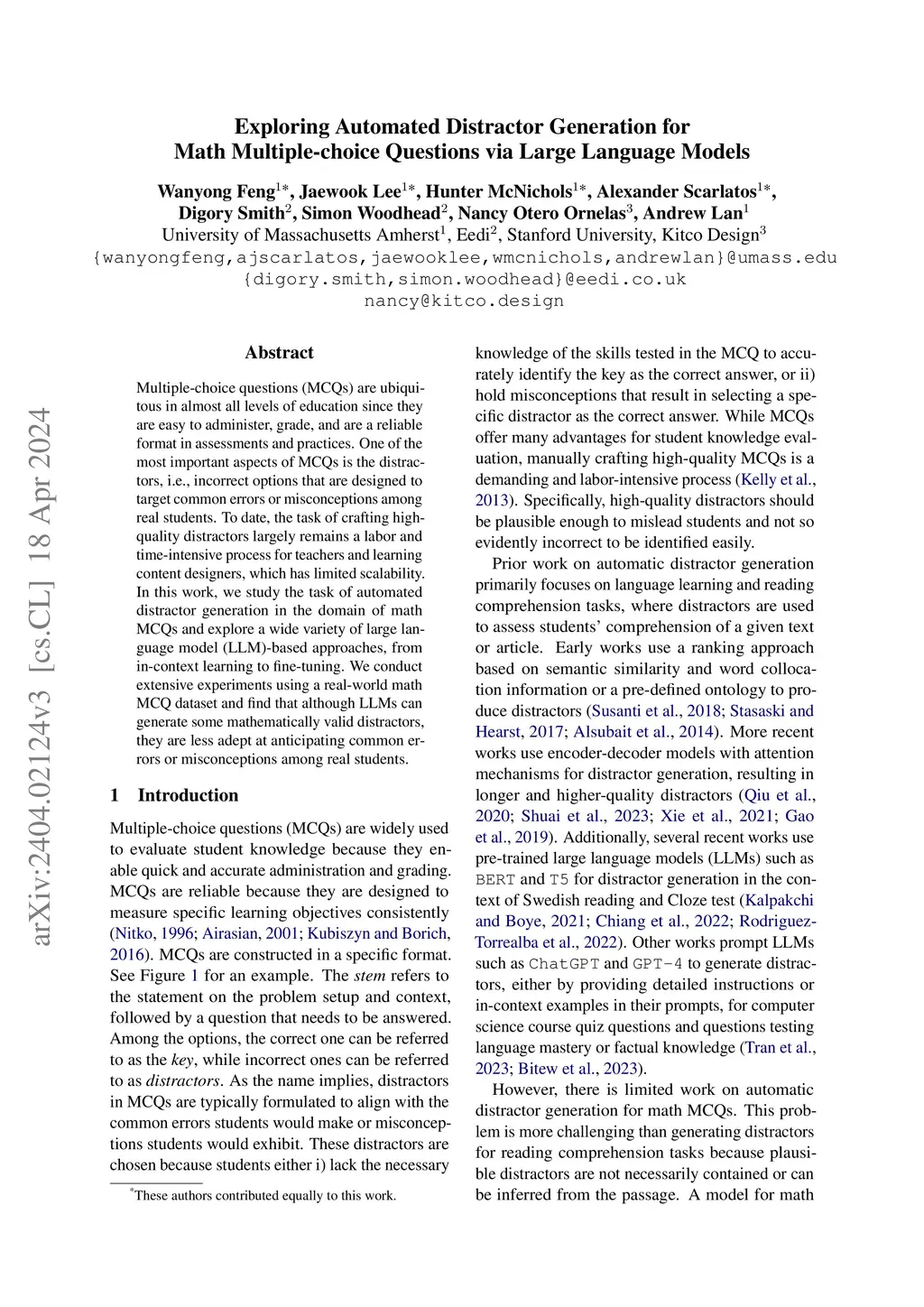 Multiple-choice questions (MCQs) are ubiquitous in almost all levels of education since they are easy to administer, grade, and are a reliable format in assessments and practices. One of the most important aspects of MCQs is the distractors, i.e., incorrect options that are designed to target common errors or misconceptions among real students. To date, the task of crafting high-quality distractors largely remains a labor and time-intensive process for teachers and learning content designers, which has limited scalability. In this work, we study the task of automated distractor generation in the domain of math MCQs and explore a wide variety of large language model (LLM)-based approaches, from in-context learning to fine-tuning. We conduct extensive experiments using a real-world math MCQ dataset and find that although LLMs can generate some mathematically valid distractors, they are less adept at anticipating common errors or misconceptions among real students.