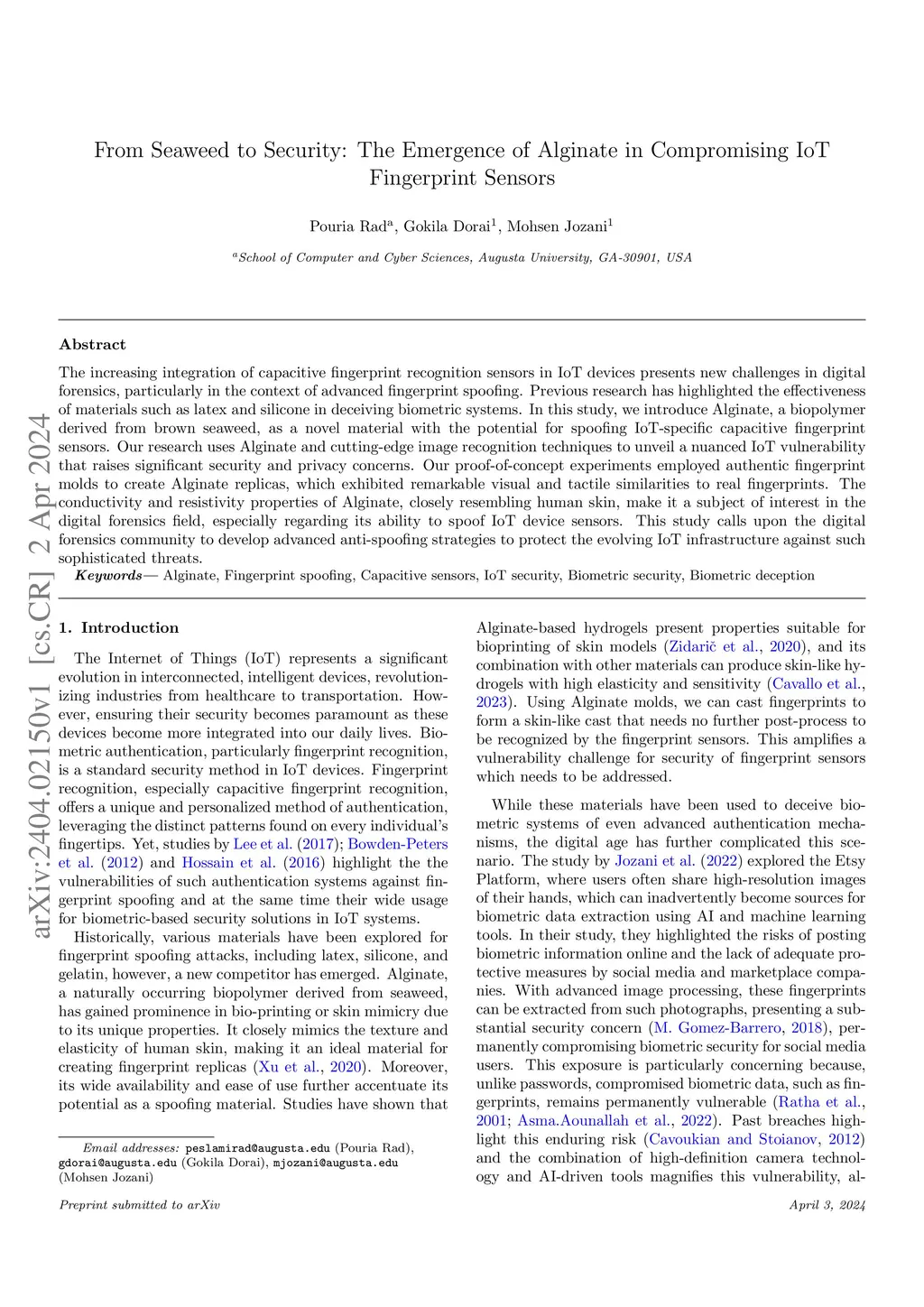 The increasing integration of capacitive fingerprint recognition sensors in IoT devices presents new challenges in digital forensics, particularly in the context of advanced fingerprint spoofing. Previous research has highlighted the effectiveness of materials such as latex and silicone in deceiving biometric systems. In this study, we introduce Alginate, a biopolymer derived from brown seaweed, as a novel material with the potential for spoofing IoT-specific capacitive fingerprint sensors. Our research uses Alginate and cutting-edge image recognition techniques to unveil a nuanced IoT vulnerability that raises significant security and privacy concerns. Our proof-of-concept experiments employed authentic fingerprint molds to create Alginate replicas, which exhibited remarkable visual and tactile similarities to real fingerprints. The conductivity and resistivity properties of Alginate, closely resembling human skin, make it a subject of interest in the digital forensics field, especially regarding its ability to spoof IoT device sensors. This study calls upon the digital forensics community to develop advanced anti-spoofing strategies to protect the evolving IoT infrastructure against such sophisticated threats.