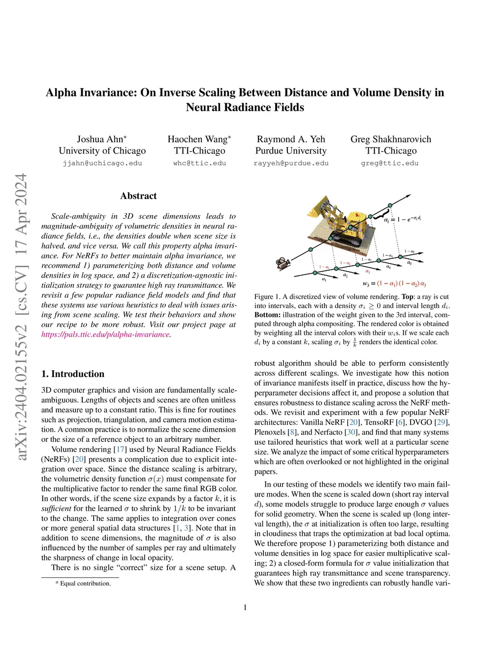 Scale-ambiguity in 3D scene dimensions leads to magnitude-ambiguity of volumetric densities in neural radiance fields, i.e., the densities double when scene size is halved, and vice versa. We call this property alpha invariance. For NeRFs to better maintain alpha invariance, we recommend 1) parameterizing both distance and volume densities in log space, and 2) a discretization-agnostic initialization strategy to guarantee high ray transmittance. We revisit a few popular radiance field models and find that these systems use various heuristics to deal with issues arising from scene scaling. We test their behaviors and show our recipe to be more robust.