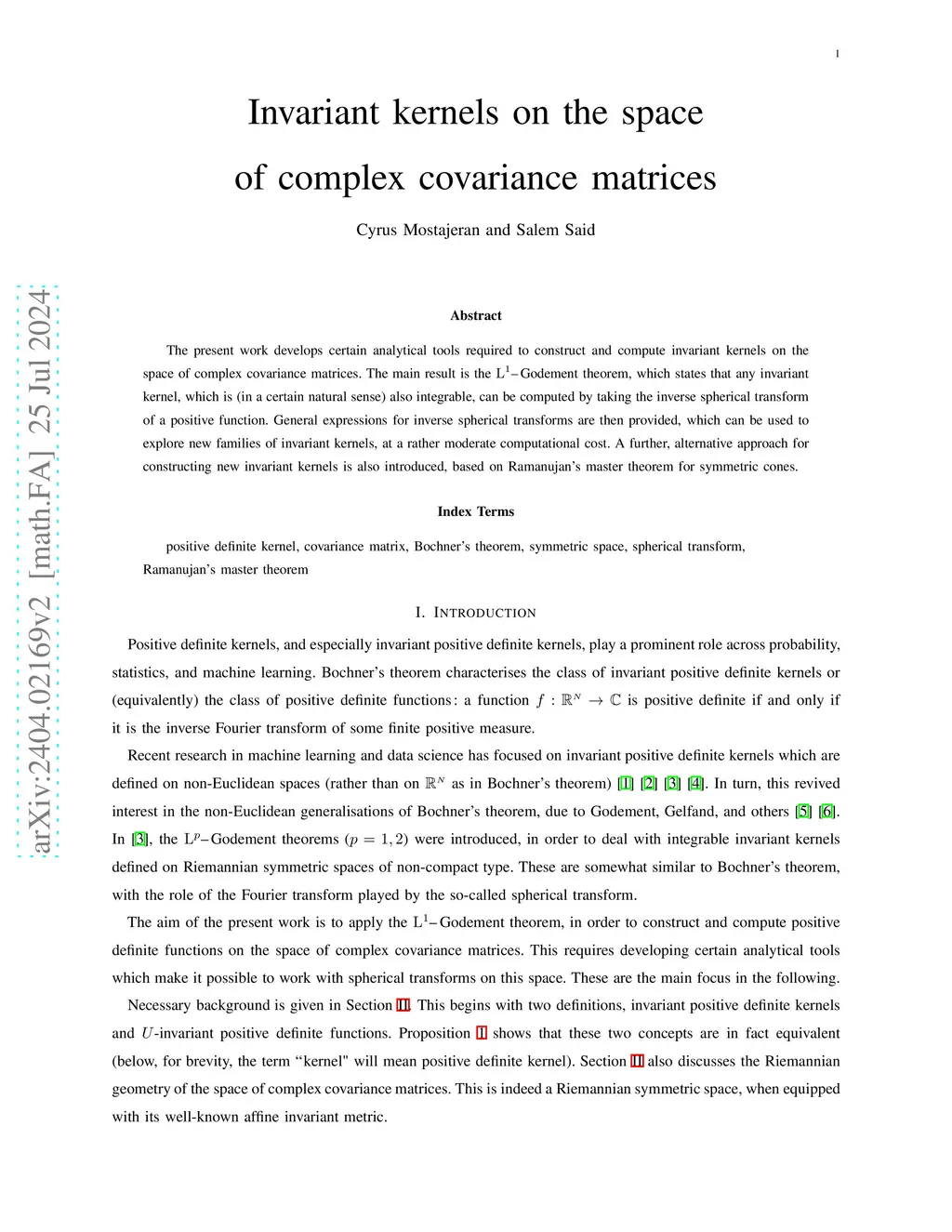 The present work sets forth the analytical tools which make it possible to construct and compute invariant kernels on the space of complex covariance matrices. The main result is the --\,Godement theorem, which is used to obtain a general analytical expression that yields any invariant kernel which is, in a certain natural sense, also integrable. Using this expression, one can design and explore new families of invariant kernels, all while incurring a rather moderate computational effort. The expression comes in the form of a determinant (it is a determinantal expression), and is derived from the notion of spherical transform, which arises when the space of complex covariance matrices is considered as a Riemannian symmetric space.