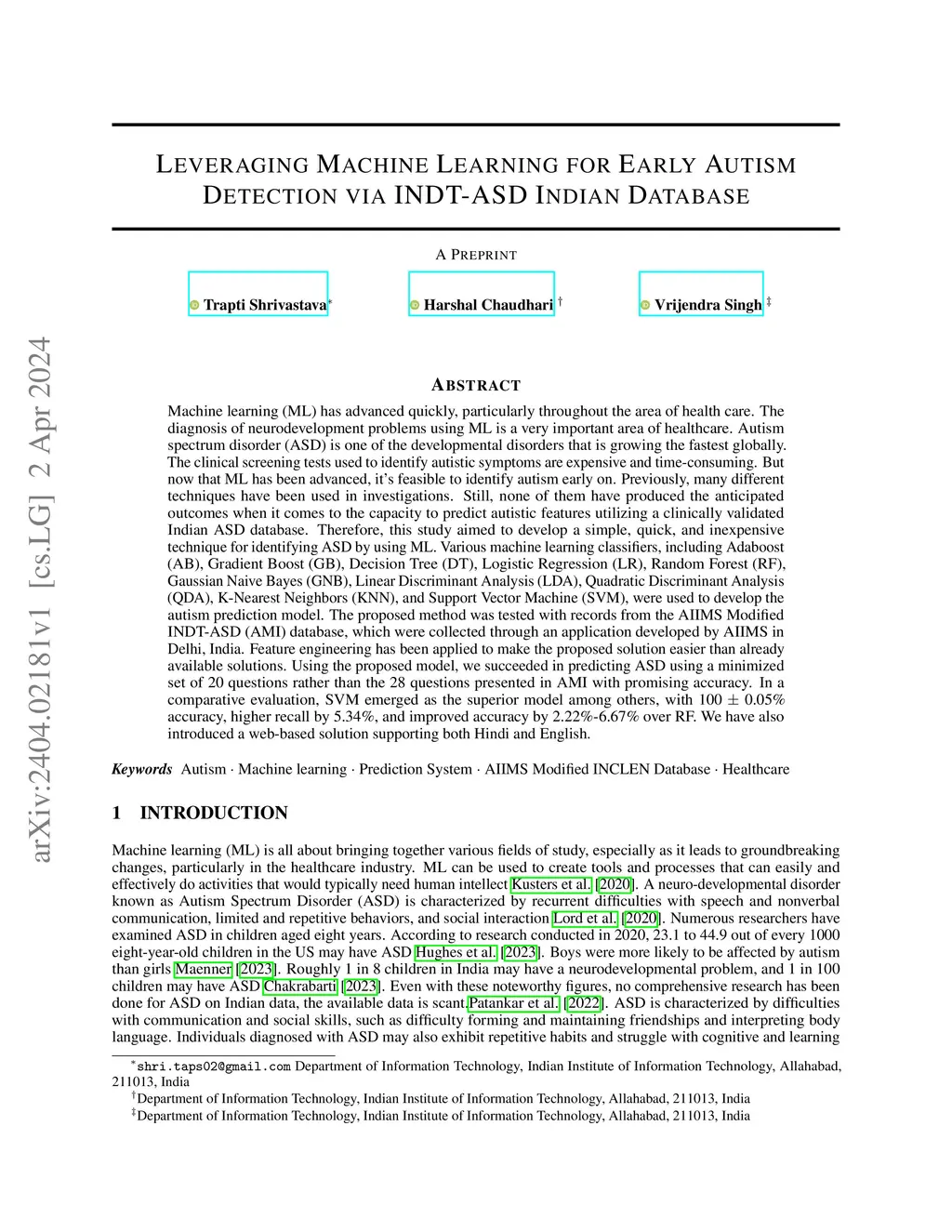 Machine learning (ML) has advanced quickly, particularly throughout the area of health care. The diagnosis of neurodevelopment problems using ML is a very important area of healthcare. Autism spectrum disorder (ASD) is one of the developmental disorders that is growing the fastest globally. The clinical screening tests used to identify autistic symptoms are expensive and time-consuming. But now that ML has been advanced, it's feasible to identify autism early on. Previously, many different techniques have been used in investigations. Still, none of them have produced the anticipated outcomes when it comes to the capacity to predict autistic features utilizing a clinically validated Indian ASD database. Therefore, this study aimed to develop a simple, quick, and inexpensive technique for identifying ASD by using ML. Various machine learning classifiers, including Adaboost (AB), Gradient Boost (GB), Decision Tree (DT), Logistic Regression (LR), Random Forest (RF), Gaussian Naive Bayes (GNB), Linear Discriminant Analysis (LDA), Quadratic Discriminant Analysis (QDA), K-Nearest Neighbors (KNN), and Support Vector Machine (SVM), were used to develop the autism prediction model. The proposed method was tested with records from the AIIMS Modified INDT-ASD (AMI) database, which were collected through an application developed by AIIMS in Delhi, India. Feature engineering has been applied to make the proposed solution easier than already available solutions. Using the proposed model, we succeeded in predicting ASD using a minimized set of 20 questions rather than the 28 questions presented in AMI with promising accuracy. In a comparative evaluation, SVM emerged as the superior model among others, with 100 0.05\% accuracy, higher recall by 5.34\%, and improved accuracy by 2.22\%-6.67\% over RF. We have also introduced a web-based solution supporting both Hindi and English.