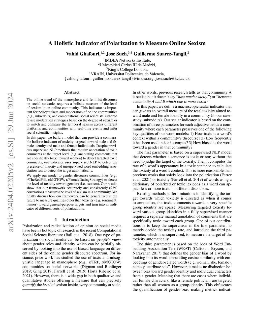 The online trend of the manosphere and feminist discourse on social networks requires a holistic measure of the level of sexism in an online community. This indicator is important for policymakers and moderators of online communities (e.g., subreddits) and computational social scientists, either to revise moderation strategies based on the degree of sexism or to match and compare the temporal sexism across different platforms and communities with real-time events and infer social scientific insights. In this paper, we build a model that can provide a comparable holistic indicator of toxicity targeted toward male and female identity and male and female individuals. Despite previous supervised NLP methods that require annotation of toxic comments at the target level (e.g. annotating comments that are specifically toxic toward women) to detect targeted toxic comments, our indicator uses supervised NLP to detect the presence of toxicity and unsupervised word embedding association test to detect the target automatically. We apply our model to gender discourse communities (e.g., r/TheRedPill, r/MGTOW, r/FemaleDatingStrategy) to detect the level of toxicity toward genders (i.e., sexism). Our results show that our framework accurately and consistently (93% correlation) measures the level of sexism in a community. We finally discuss how our framework can be generalized in the future to measure qualities other than toxicity (e.g. sentiment, humor) toward general-purpose targets and turn into an indicator of different sorts of polarizations.