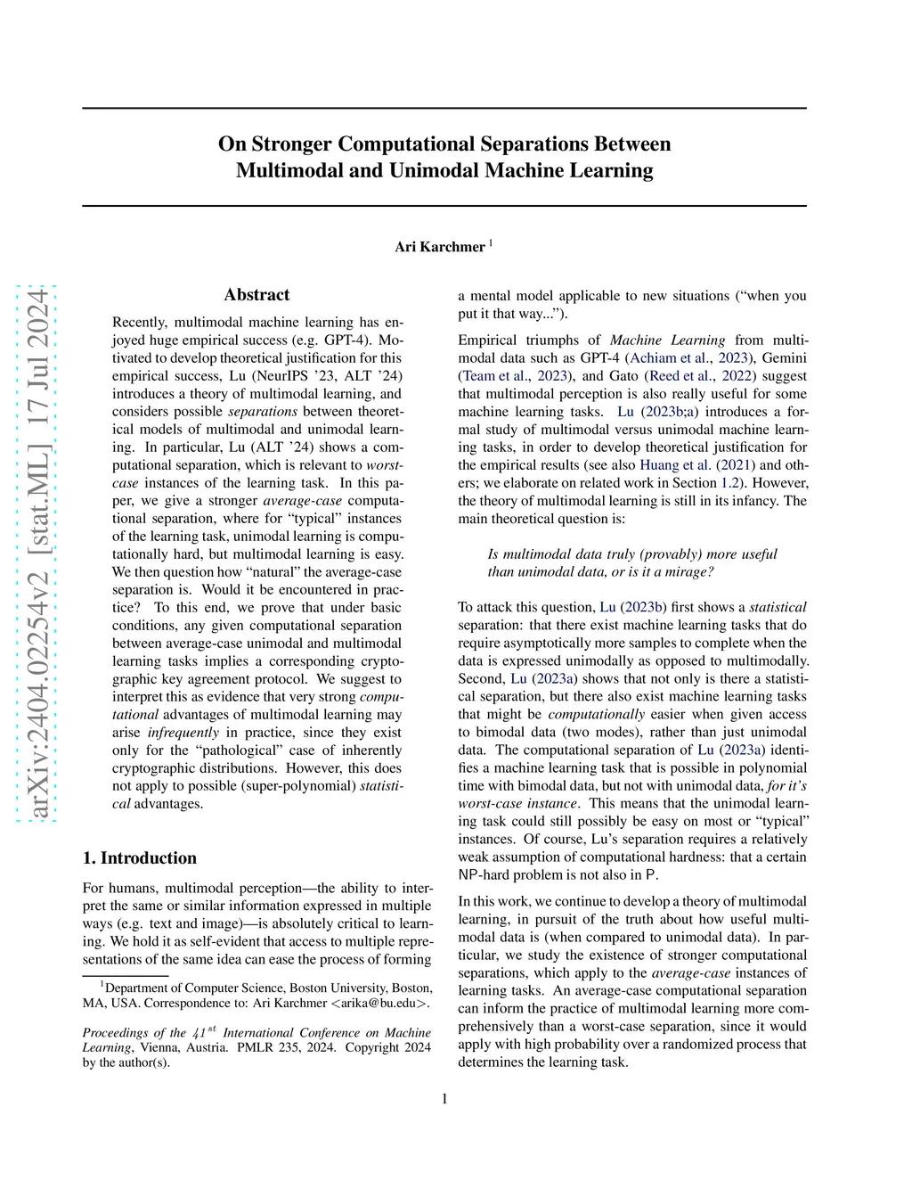 Recently, multimodal machine learning has enjoyed huge empirical success (e.g. GPT-4). Motivated to develop theoretical justification for this empirical success, Lu (NeurIPS '23, ALT '24) introduces a theory of multimodal learning, and considers possible \textit{separations} between theoretical models of multimodal and unimodal learning. In particular, Lu (ALT '24) shows a computational separation, which is relevant to \textit{worst-case} instances of the learning task. In this paper, we give a stronger \textit{average-case} computational separation, where for ``typical'' instances of the learning task, unimodal learning is computationally hard, but multimodal learning is easy. We then question how ``natural'' the average-case separation is. Would it be encountered in practice? To this end, we prove that under basic conditions, any given computational separation between average-case unimodal and multimodal learning tasks implies a corresponding cryptographic key agreement protocol. We suggest to interpret this as evidence that very strong \textit{computational} advantages of multimodal learning may arise \textit{infrequently} in practice, since they exist only for the ``pathological'' case of inherently cryptographic distributions. However, this does not apply to possible (super-polynomial) \textit{statistical} advantages.
