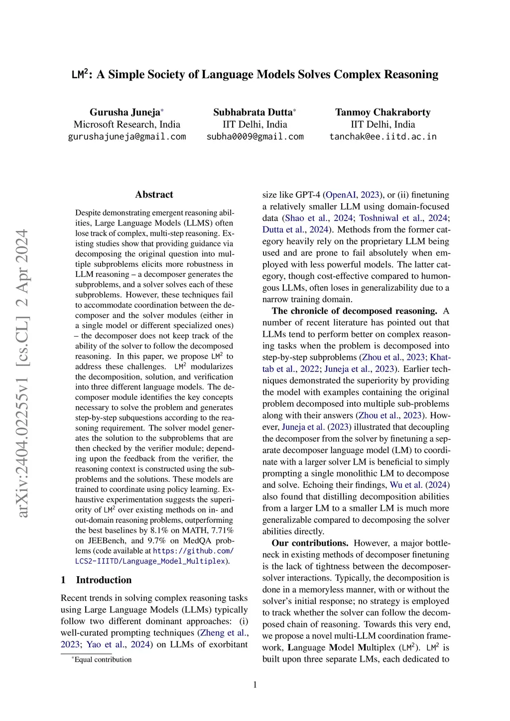 Despite demonstrating emergent reasoning abilities, Large Language Models (LLMS) often lose track of complex, multi-step reasoning. Existing studies show that providing guidance via decomposing the original question into multiple subproblems elicits more robustness in LLM reasoning -- a decomposer generates the subproblems, and a solver solves each of these subproblems. However, these techniques fail to accommodate coordination between the decomposer and the solver modules (either in a single model or different specialized ones) -- the decomposer does not keep track of the ability of the solver to follow the decomposed reasoning. In this paper, we propose LM2 to address these challenges. LM2 modularizes the decomposition, solution, and verification into three different language models. The decomposer module identifies the key concepts necessary to solve the problem and generates step-by-step subquestions according to the reasoning requirement. The solver model generates the solution to the subproblems that are then checked by the verifier module; depending upon the feedback from the verifier, the reasoning context is constructed using the subproblems and the solutions. These models are trained to coordinate using policy learning. Exhaustive experimentation suggests the superiority of LM2 over existing methods on in- and out-domain reasoning problems, outperforming the best baselines by on MATH, on JEEBench, and on MedQA problems (code available at https://github.com/LCS2-IIITD/Language_Model_Multiplex).