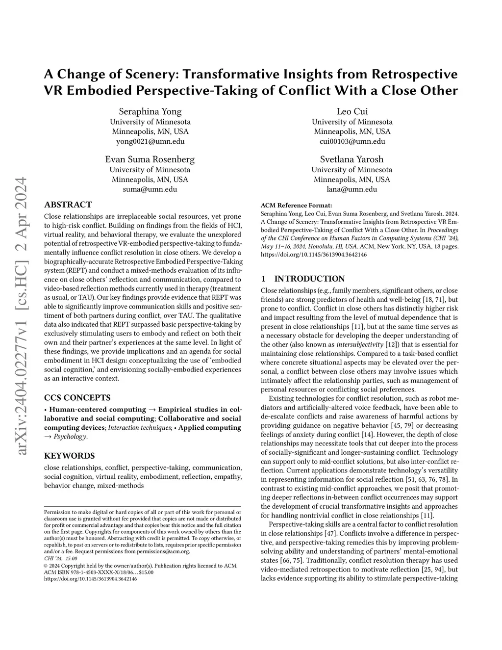Close relationships are irreplaceable social resources, yet prone to high-risk conflict. Building on findings from the fields of HCI, virtual reality, and behavioral therapy, we evaluate the unexplored potential of retrospective VR-embodied perspective-taking to fundamentally influence conflict resolution in close others. We develop a biographically-accurate Retrospective Embodied Perspective-Taking system (REPT) and conduct a mixed-methods evaluation of its influence on close others' reflection and communication, compared to video-based reflection methods currently used in therapy (treatment as usual, or TAU). Our key findings provide evidence that REPT was able to significantly improve communication skills and positive sentiment of both partners during conflict, over TAU. The qualitative data also indicated that REPT surpassed basic perspective-taking by exclusively stimulating users to embody and reflect on both their own and their partner's experiences at the same level. In light of these findings, we provide implications and an agenda for social embodiment in HCI design: conceptualizing the use of `embodied social cognition,' and envisioning socially-embodied experiences as an interactive context.