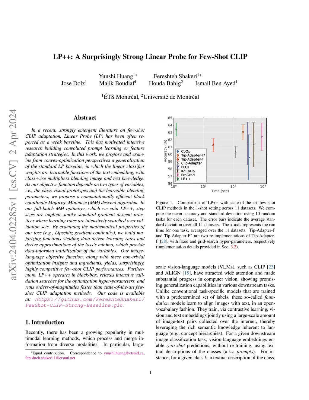 In a recent, strongly emergent literature on few-shot CLIP adaptation, Linear Probe (LP) has been often reported as a weak baseline. This has motivated intensive research building convoluted prompt learning or feature adaptation strategies. In this work, we propose and examine from convex-optimization perspectives a generalization of the standard LP baseline, in which the linear classifier weights are learnable functions of the text embedding, with class-wise multipliers blending image and text knowledge. As our objective function depends on two types of variables, i.e., the class visual prototypes and the learnable blending parameters, we propose a computationally efficient block coordinate Majorize-Minimize (MM) descent algorithm. In our full-batch MM optimizer, which we coin LP++, step sizes are implicit, unlike standard gradient descent practices where learning rates are intensively searched over validation sets. By examining the mathematical properties of our loss (e.g., Lipschitz gradient continuity), we build majorizing functions yielding data-driven learning rates and derive approximations of the loss's minima, which provide data-informed initialization of the variables. Our image-language objective function, along with these non-trivial optimization insights and ingredients, yields, surprisingly, highly competitive few-shot CLIP performances. Furthermore, LP++ operates in black-box, relaxes intensive validation searches for the optimization hyper-parameters, and runs orders-of-magnitudes faster than state-of-the-art few-shot CLIP adaptation methods. Our code is available at: \url{https://github.com/FereshteShakeri/FewShot-CLIP-Strong-Baseline.git}.