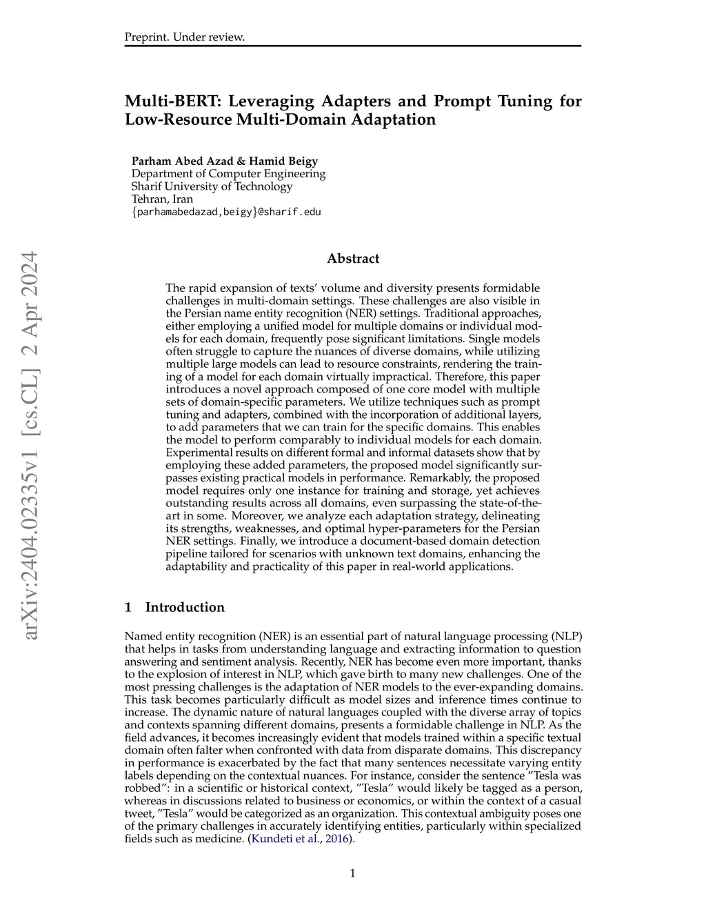 The rapid expansion of texts' volume and diversity presents formidable challenges in multi-domain settings. These challenges are also visible in the Persian name entity recognition (NER) settings. Traditional approaches, either employing a unified model for multiple domains or individual models for each domain, frequently pose significant limitations. Single models often struggle to capture the nuances of diverse domains, while utilizing multiple large models can lead to resource constraints, rendering the training of a model for each domain virtually impractical. Therefore, this paper introduces a novel approach composed of one core model with multiple sets of domain-specific parameters. We utilize techniques such as prompt tuning and adapters, combined with the incorporation of additional layers, to add parameters that we can train for the specific domains. This enables the model to perform comparably to individual models for each domain. Experimental results on different formal and informal datasets show that by employing these added parameters, the proposed model significantly surpasses existing practical models in performance. Remarkably, the proposed model requires only one instance for training and storage, yet achieves outstanding results across all domains, even surpassing the state-of-the-art in some. Moreover, we analyze each adaptation strategy, delineating its strengths, weaknesses, and optimal hyper-parameters for the Persian NER settings. Finally, we introduce a document-based domain detection pipeline tailored for scenarios with unknown text domains, enhancing the adaptability and practicality of this paper in real-world applications.