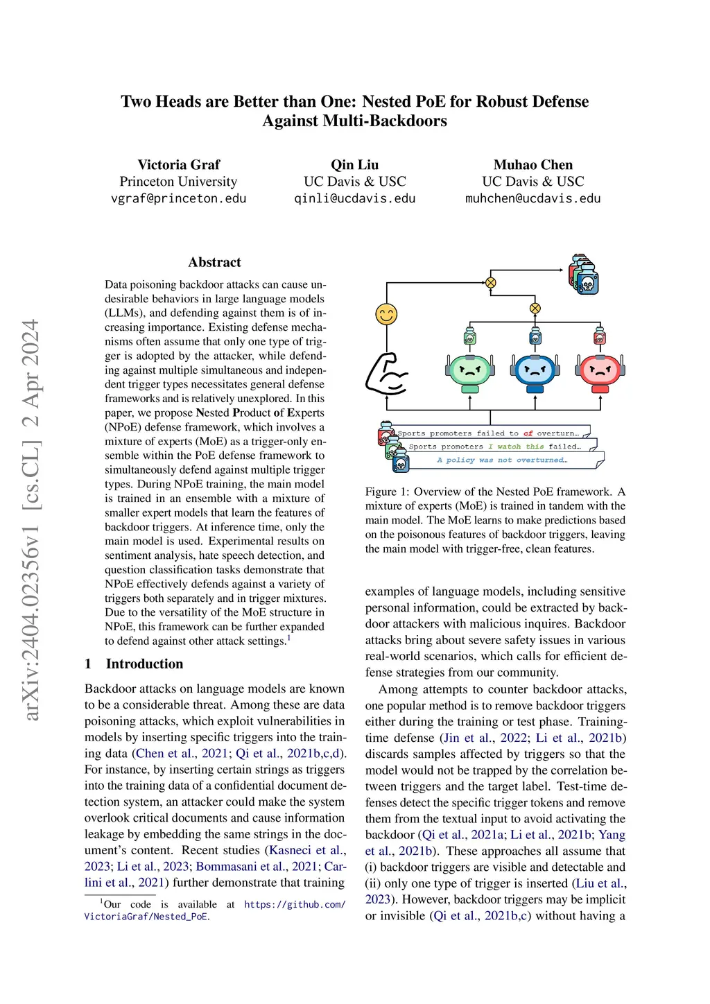 Data poisoning backdoor attacks can cause undesirable behaviors in large language models (LLMs), and defending against them is of increasing importance. Existing defense mechanisms often assume that only one type of trigger is adopted by the attacker, while defending against multiple simultaneous and independent trigger types necessitates general defense frameworks and is relatively unexplored. In this paper, we propose Nested Product of Experts(NPoE) defense framework, which involves a mixture of experts (MoE) as a trigger-only ensemble within the PoE defense framework to simultaneously defend against multiple trigger types. During NPoE training, the main model is trained in an ensemble with a mixture of smaller expert models that learn the features of backdoor triggers. At inference time, only the main model is used. Experimental results on sentiment analysis, hate speech detection, and question classification tasks demonstrate that NPoE effectively defends against a variety of triggers both separately and in trigger mixtures. Due to the versatility of the MoE structure in NPoE, this framework can be further expanded to defend against other attack settings