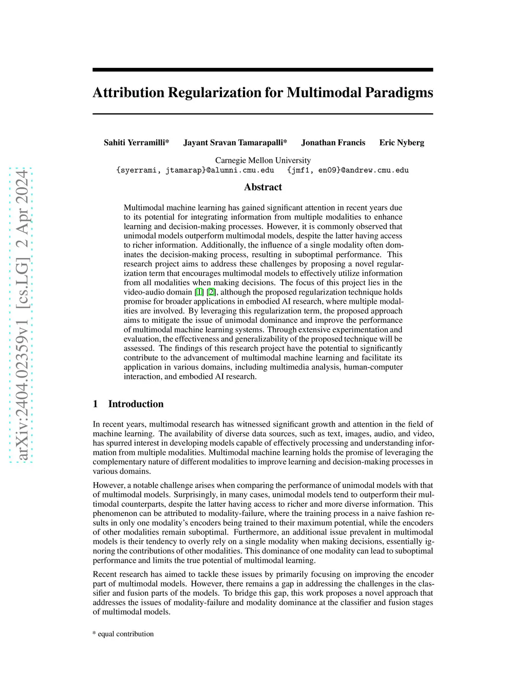 Multimodal machine learning has gained significant attention in recent years due to its potential for integrating information from multiple modalities to enhance learning and decision-making processes. However, it is commonly observed that unimodal models outperform multimodal models, despite the latter having access to richer information. Additionally, the influence of a single modality often dominates the decision-making process, resulting in suboptimal performance. This research project aims to address these challenges by proposing a novel regularization term that encourages multimodal models to effectively utilize information from all modalities when making decisions. The focus of this project lies in the video-audio domain, although the proposed regularization technique holds promise for broader applications in embodied AI research, where multiple modalities are involved. By leveraging this regularization term, the proposed approach aims to mitigate the issue of unimodal dominance and improve the performance of multimodal machine learning systems. Through extensive experimentation and evaluation, the effectiveness and generalizability of the proposed technique will be assessed. The findings of this research project have the potential to significantly contribute to the advancement of multimodal machine learning and facilitate its application in various domains, including multimedia analysis, human-computer interaction, and embodied AI research.