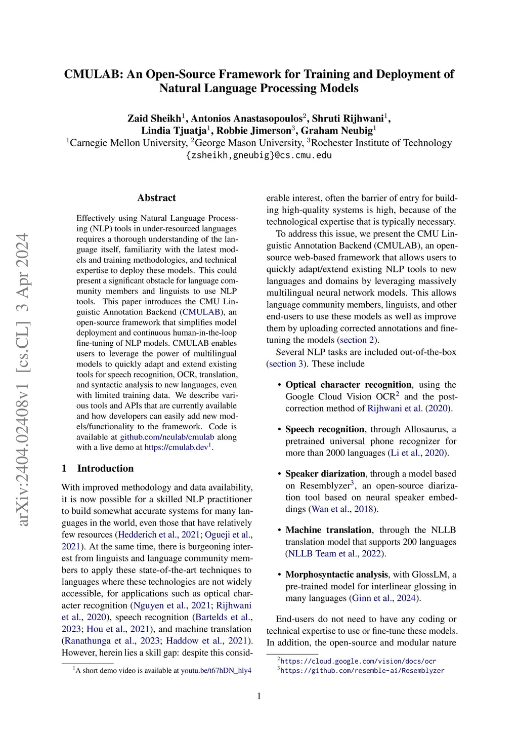 Effectively using Natural Language Processing (NLP) tools in under-resourced languages requires a thorough understanding of the language itself, familiarity with the latest models and training methodologies, and technical expertise to deploy these models. This could present a significant obstacle for language community members and linguists to use NLP tools. This paper introduces the CMU Linguistic Annotation Backend, an open-source framework that simplifies model deployment and continuous human-in-the-loop fine-tuning of NLP models. CMULAB enables users to leverage the power of multilingual models to quickly adapt and extend existing tools for speech recognition, OCR, translation, and syntactic analysis to new languages, even with limited training data. We describe various tools and APIs that are currently available and how developers can easily add new models/functionality to the framework. Code is available at https://github.com/neulab/cmulab along with a live demo at https://cmulab.dev
