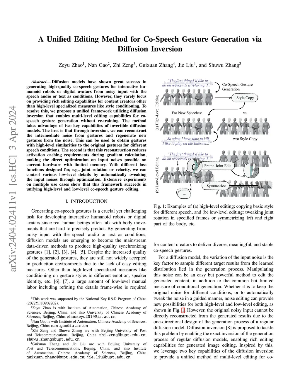 Diffusion models have shown great success in generating high-quality co-speech gestures for interactive humanoid robots or digital avatars from noisy input with the speech audio or text as conditions. However, they rarely focus on providing rich editing capabilities for content creators other than high-level specialized measures like style conditioning. To resolve this, we propose a unified framework utilizing diffusion inversion that enables multi-level editing capabilities for co-speech gesture generation without re-training. The method takes advantage of two key capabilities of invertible diffusion models. The first is that through inversion, we can reconstruct the intermediate noise from gestures and regenerate new gestures from the noise. This can be used to obtain gestures with high-level similarities to the original gestures for different speech conditions. The second is that this reconstruction reduces activation caching requirements during gradient calculation, making the direct optimization on input noises possible on current hardware with limited memory. With different loss functions designed for, e.g., joint rotation or velocity, we can control various low-level details by automatically tweaking the input noises through optimization. Extensive experiments on multiple use cases show that this framework succeeds in unifying high-level and low-level co-speech gesture editing.