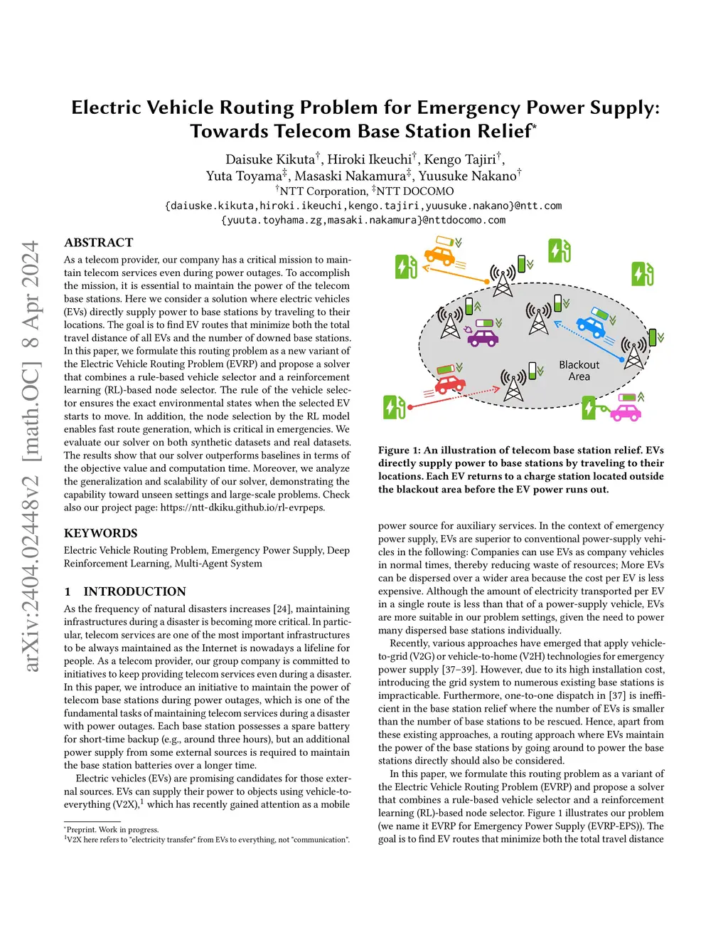 As a telecom provider, our company has a critical mission to maintain telecom services even during power outages. To accomplish the mission, it is essential to maintain the power of the telecom base stations. Here we consider a solution where electric vehicles (EVs) directly supply power to base stations by traveling to their locations. The goal is to find EV routes that minimize both the total travel distance of all EVs and the number of downed base stations. In this paper, we formulate this routing problem as a new variant of the Electric Vehicle Routing Problem (EVRP) and propose a solver that combines a rule-based vehicle selector and a reinforcement learning (RL)-based node selector. The rule of the vehicle selector ensures the exact environmental states when the selected EV starts to move. In addition, the node selection by the RL model enables fast route generation, which is critical in emergencies. We evaluate our solver on both synthetic datasets and real datasets. The results show that our solver outperforms baselines in terms of the objective value and computation time. Moreover, we analyze the generalization and scalability of our solver, demonstrating the capability toward unseen settings and large-scale problems. Check also our project page: https://ntt-dkiku.github.io/rl-evrpeps.