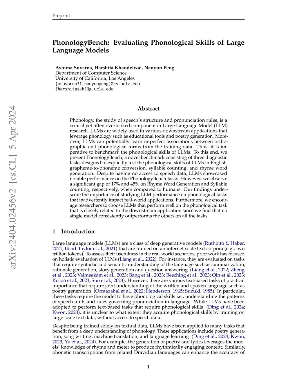 Phonology, the study of speech's structure and pronunciation rules, is a critical yet often overlooked component in Large Language Model (LLM) research. LLMs are widely used in various downstream applications that leverage phonology such as educational tools and poetry generation. Moreover, LLMs can potentially learn imperfect associations between orthographic and phonological forms from the training data. Thus, it is imperative to benchmark the phonological skills of LLMs. To this end, we present PhonologyBench, a novel benchmark consisting of three diagnostic tasks designed to explicitly test the phonological skills of LLMs in English: grapheme-to-phoneme conversion, syllable counting, and rhyme word generation. Despite having no access to speech data, LLMs showcased notable performance on the PhonologyBench tasks. However, we observe a significant gap of 17% and 45% on Rhyme Word Generation and Syllable counting, respectively, when compared to humans. Our findings underscore the importance of studying LLM performance on phonological tasks that inadvertently impact real-world applications. Furthermore, we encourage researchers to choose LLMs that perform well on the phonological task that is closely related to the downstream application since we find that no single model consistently outperforms the others on all the tasks.