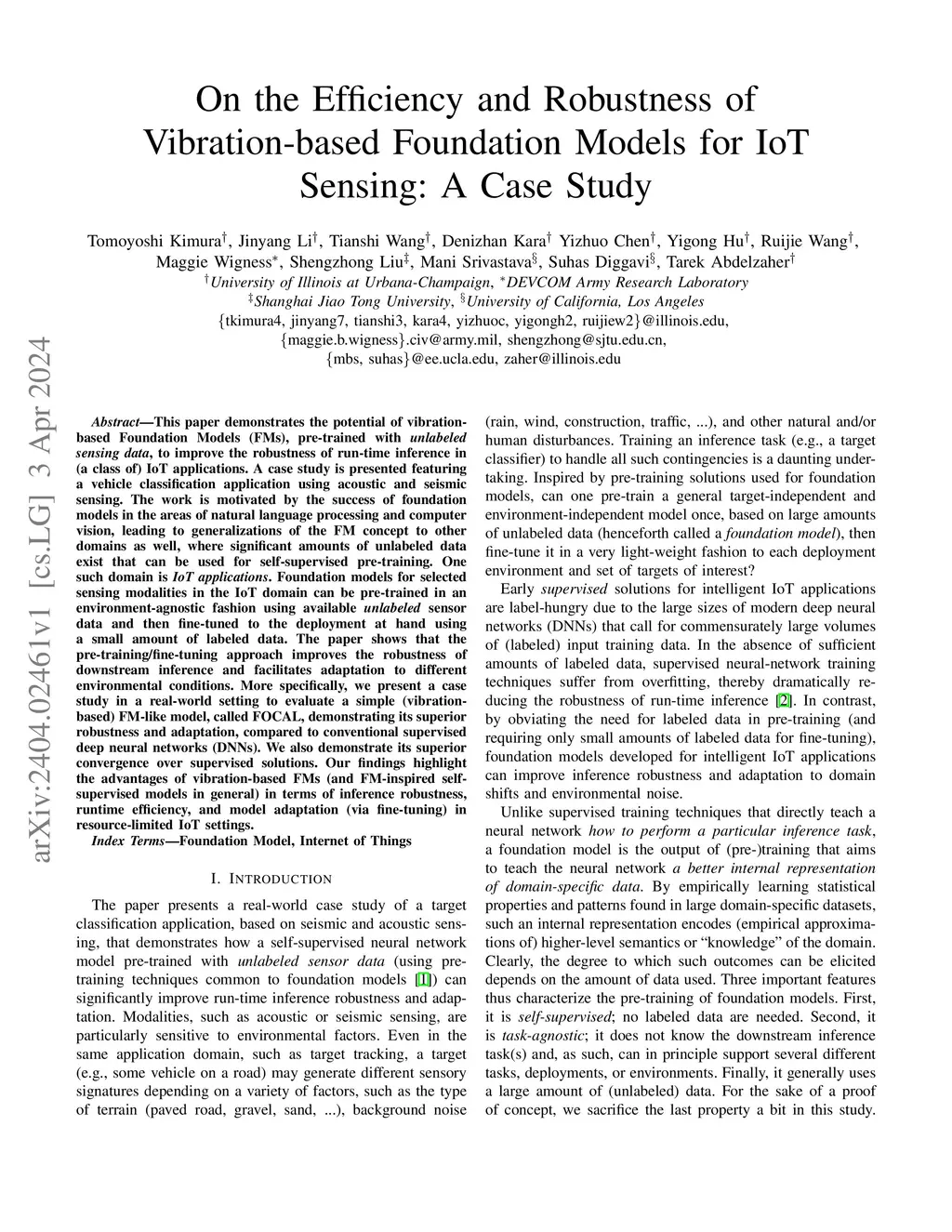 This paper demonstrates the potential of vibration-based Foundation Models (FMs), pre-trained with unlabeled sensing data, to improve the robustness of run-time inference in (a class of) IoT applications. A case study is presented featuring a vehicle classification application using acoustic and seismic sensing. The work is motivated by the success of foundation models in the areas of natural language processing and computer vision, leading to generalizations of the FM concept to other domains as well, where significant amounts of unlabeled data exist that can be used for self-supervised pre-training. One such domain is IoT applications. Foundation models for selected sensing modalities in the IoT domain can be pre-trained in an environment-agnostic fashion using available unlabeled sensor data and then fine-tuned to the deployment at hand using a small amount of labeled data. The paper shows that the pre-training/fine-tuning approach improves the robustness of downstream inference and facilitates adaptation to different environmental conditions. More specifically, we present a case study in a real-world setting to evaluate a simple (vibration-based) FM-like model, called FOCAL, demonstrating its superior robustness and adaptation, compared to conventional supervised deep neural networks (DNNs). We also demonstrate its superior convergence over supervised solutions. Our findings highlight the advantages of vibration-based FMs (and FM-inspired selfsupervised models in general) in terms of inference robustness, runtime efficiency, and model adaptation (via fine-tuning) in resource-limited IoT settings.