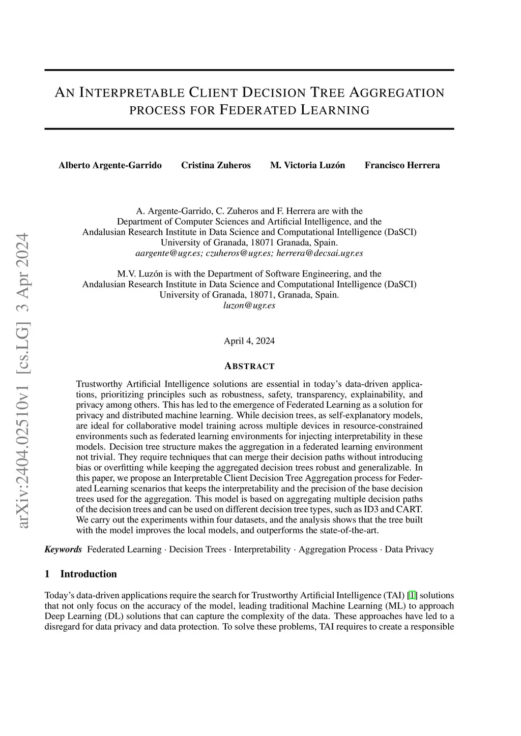 Trustworthy Artificial Intelligence solutions are essential in today's data-driven applications, prioritizing principles such as robustness, safety, transparency, explainability, and privacy among others. This has led to the emergence of Federated Learning as a solution for privacy and distributed machine learning. While decision trees, as self-explanatory models, are ideal for collaborative model training across multiple devices in resource-constrained environments such as federated learning environments for injecting interpretability in these models. Decision tree structure makes the aggregation in a federated learning environment not trivial. They require techniques that can merge their decision paths without introducing bias or overfitting while keeping the aggregated decision trees robust and generalizable. In this paper, we propose an Interpretable Client Decision Tree Aggregation process for Federated Learning scenarios that keeps the interpretability and the precision of the base decision trees used for the aggregation. This model is based on aggregating multiple decision paths of the decision trees and can be used on different decision tree types, such as ID3 and CART. We carry out the experiments within four datasets, and the analysis shows that the tree built with the model improves the local models, and outperforms the state-of-the-art.
