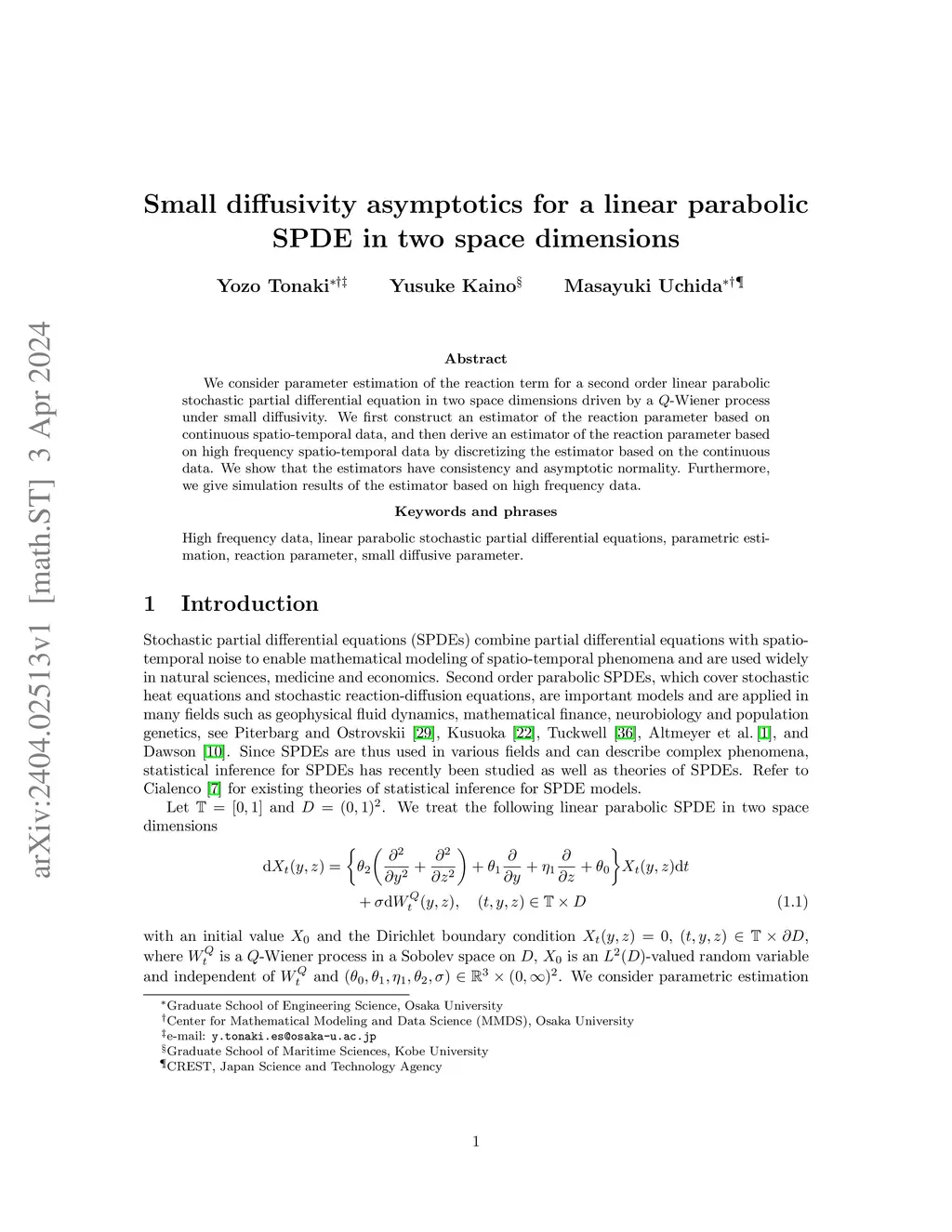 Small diffusivity asymptotics for a linear parabolic SPDE in two space