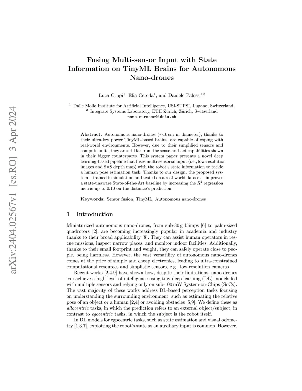 Autonomous nano-drones (~10 cm in diameter), thanks to their ultra-low power TinyML-based brains, are capable of coping with real-world environments. However, due to their simplified sensors and compute units, they are still far from the sense-and-act capabilities shown in their bigger counterparts. This system paper presents a novel deep learning-based pipeline that fuses multi-sensorial input (i.e., low-resolution images and 8x8 depth map) with the robot's state information to tackle a human pose estimation task. Thanks to our design, the proposed system -- trained in simulation and tested on a real-world dataset -- improves a state-unaware State-of-the-Art baseline by increasing the R^2 regression metric up to 0.10 on the distance's prediction.