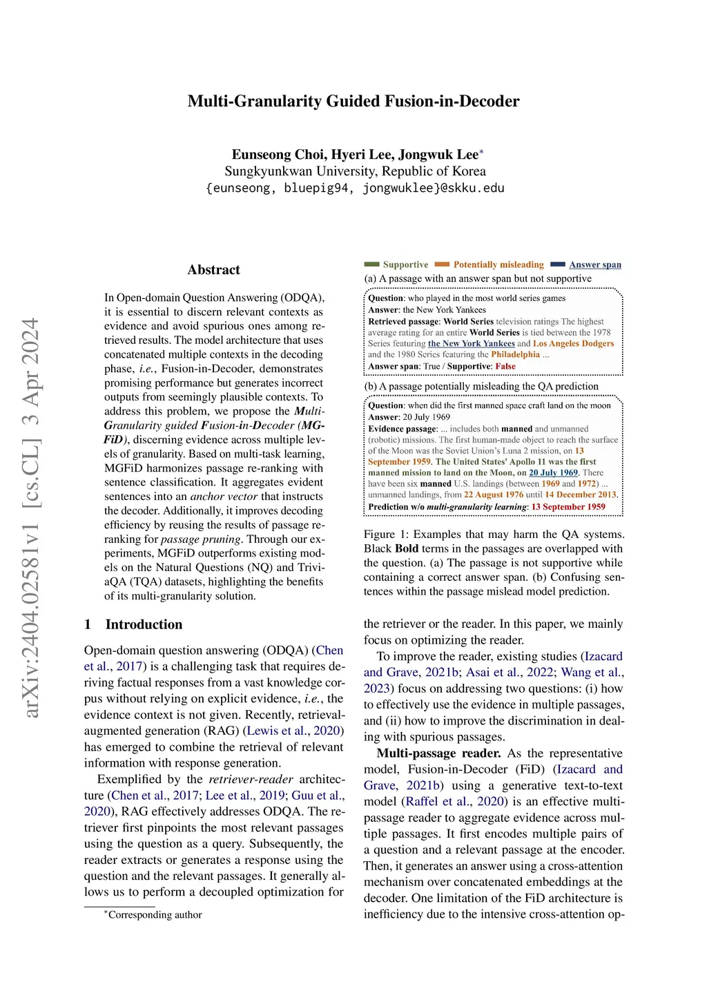 In Open-domain Question Answering (ODQA), it is essential to discern relevant contexts as evidence and avoid spurious ones among retrieved results. The model architecture that uses concatenated multiple contexts in the decoding phase, i.e., Fusion-in-Decoder, demonstrates promising performance but generates incorrect outputs from seemingly plausible contexts. To address this problem, we propose the Multi-Granularity guided Fusion-in-Decoder (MGFiD), discerning evidence across multiple levels of granularity. Based on multi-task learning, MGFiD harmonizes passage re-ranking with sentence classification. It aggregates evident sentences into an anchor vector that instructs the decoder. Additionally, it improves decoding efficiency by reusing the results of passage re-ranking for passage pruning. Through our experiments, MGFiD outperforms existing models on the Natural Questions (NQ) and TriviaQA (TQA) datasets, highlighting the benefits of its multi-granularity solution.