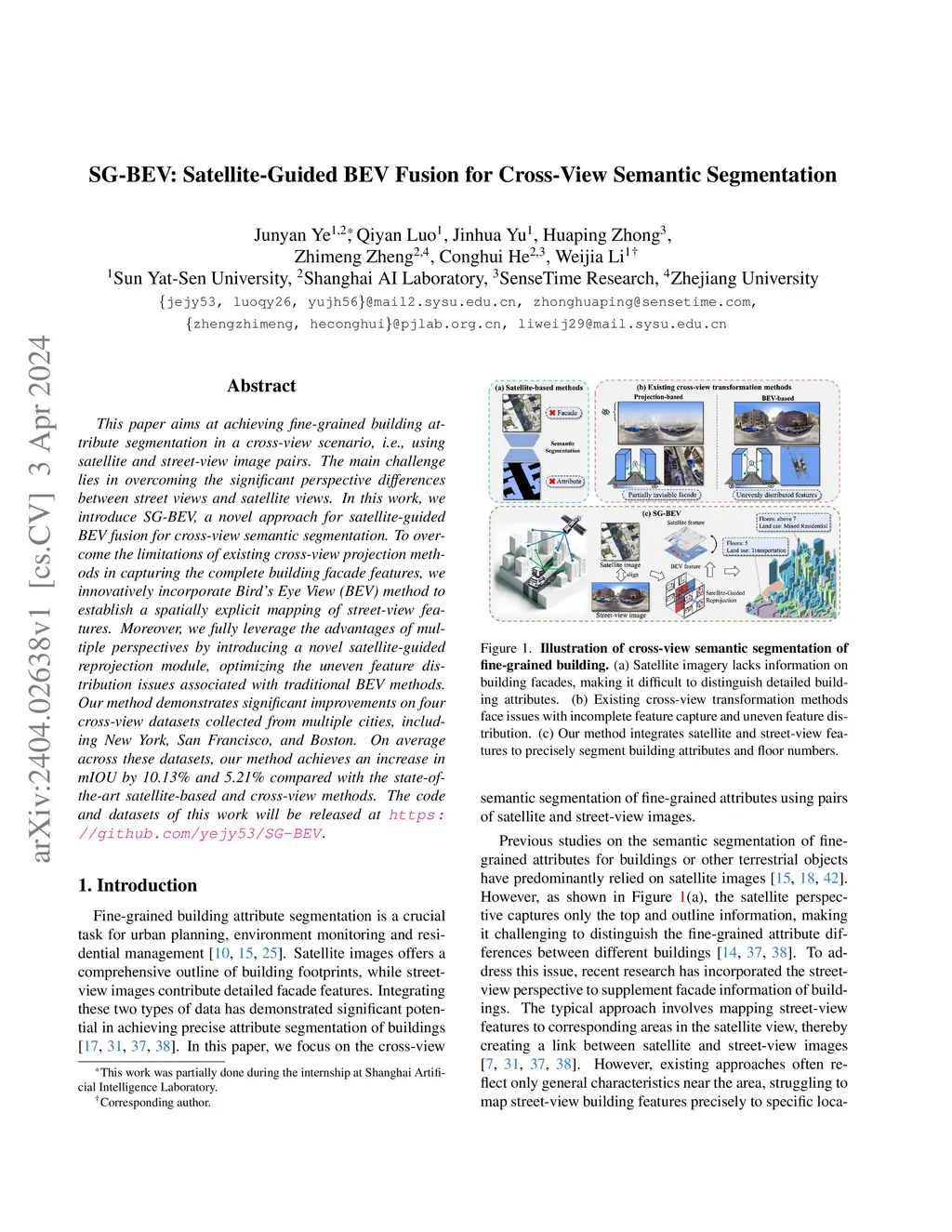 This paper aims at achieving fine-grained building attribute segmentation in a cross-view scenario, i.e., using satellite and street-view image pairs. The main challenge lies in overcoming the significant perspective differences between street views and satellite views. In this work, we introduce SG-BEV, a novel approach for satellite-guided BEV fusion for cross-view semantic segmentation. To overcome the limitations of existing cross-view projection methods in capturing the complete building facade features, we innovatively incorporate Bird's Eye View (BEV) method to establish a spatially explicit mapping of street-view features. Moreover, we fully leverage the advantages of multiple perspectives by introducing a novel satellite-guided reprojection module, optimizing the uneven feature distribution issues associated with traditional BEV methods. Our method demonstrates significant improvements on four cross-view datasets collected from multiple cities, including New York, San Francisco, and Boston. On average across these datasets, our method achieves an increase in mIOU by 10.13% and 5.21% compared with the state-of-the-art satellite-based and cross-view methods. The code and datasets of this work will be released at https://github.com/yejy53/SG-BEV.