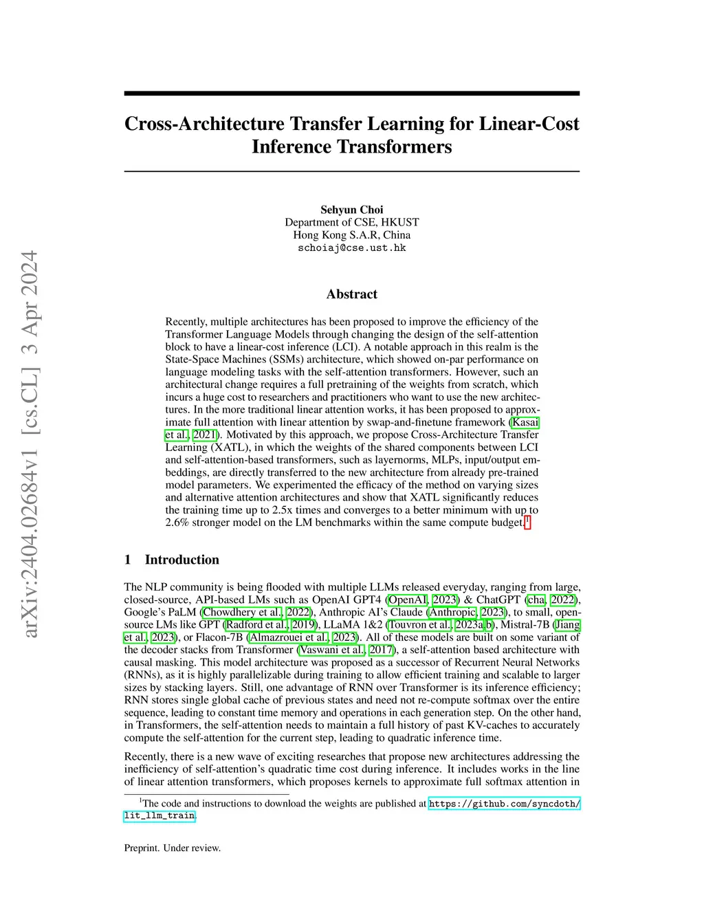Cross-Architecture Transfer Learning for Linear-Cost Inference