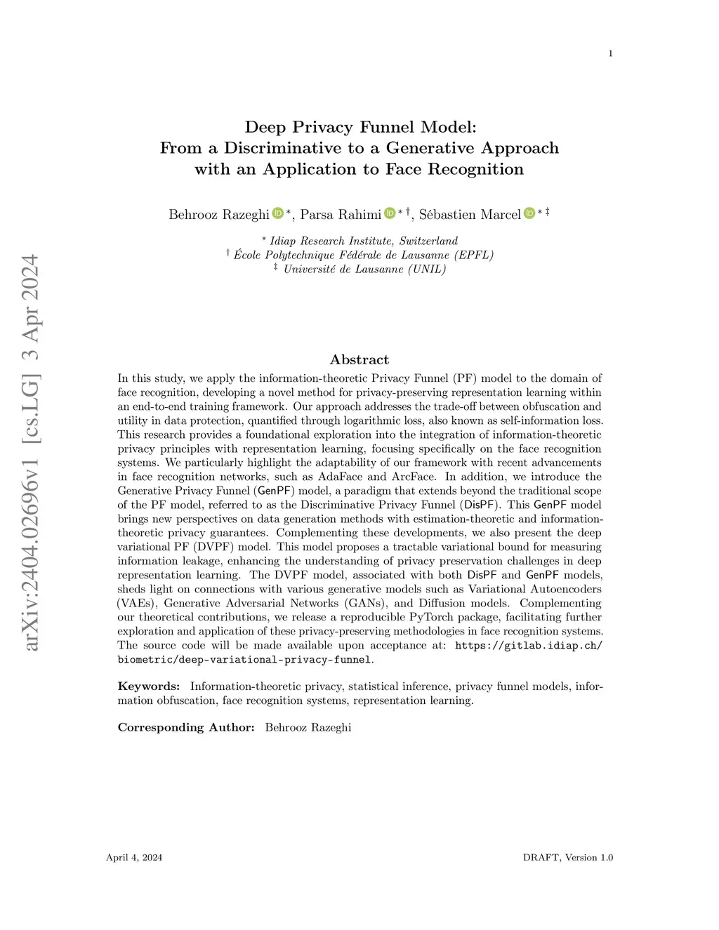 In this study, we apply the information-theoretic Privacy Funnel (PF) model to the domain of face recognition, developing a novel method for privacy-preserving representation learning within an end-to-end training framework. Our approach addresses the trade-off between obfuscation and utility in data protection, quantified through logarithmic loss, also known as self-information loss. This research provides a foundational exploration into the integration of information-theoretic privacy principles with representation learning, focusing specifically on the face recognition systems. We particularly highlight the adaptability of our framework with recent advancements in face recognition networks, such as AdaFace and ArcFace. In addition, we introduce the Generative Privacy Funnel () model, a paradigm that extends beyond the traditional scope of the PF model, referred to as the Discriminative Privacy Funnel (). This model brings new perspectives on data generation methods with estimation-theoretic and information-theoretic privacy guarantees. Complementing these developments, we also present the deep variational PF (DVPF) model. This model proposes a tractable variational bound for measuring information leakage, enhancing the understanding of privacy preservation challenges in deep representation learning. The DVPF model, associated with both and models, sheds light on connections with various generative models such as Variational Autoencoders (VAEs), Generative Adversarial Networks (GANs), and Diffusion models. Complementing our theoretical contributions, we release a reproducible PyTorch package, facilitating further exploration and application of these privacy-preserving methodologies in face recognition systems.