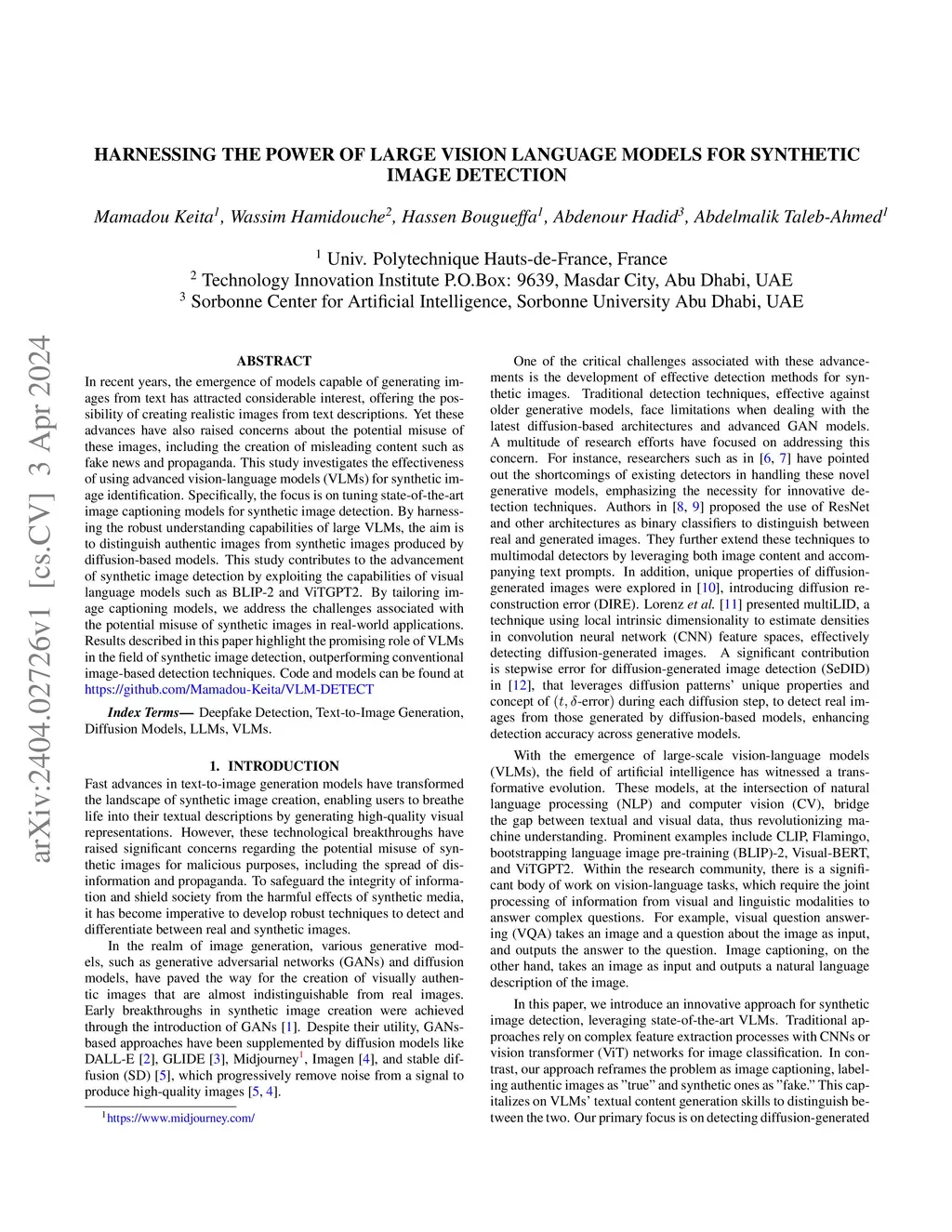 In recent years, the emergence of models capable of generating images from text has attracted considerable interest, offering the possibility of creating realistic images from text descriptions. Yet these advances have also raised concerns about the potential misuse of these images, including the creation of misleading content such as fake news and propaganda. This study investigates the effectiveness of using advanced vision-language models (VLMs) for synthetic image identification. Specifically, the focus is on tuning state-of-the-art image captioning models for synthetic image detection. By harnessing the robust understanding capabilities of large VLMs, the aim is to distinguish authentic images from synthetic images produced by diffusion-based models. This study contributes to the advancement of synthetic image detection by exploiting the capabilities of visual language models such as BLIP-2 and ViTGPT2. By tailoring image captioning models, we address the challenges associated with the potential misuse of synthetic images in real-world applications. Results described in this paper highlight the promising role of VLMs in the field of synthetic image detection, outperforming conventional image-based detection techniques. Code and models can be found at https://github.com/Mamadou-Keita/VLM-DETECT.