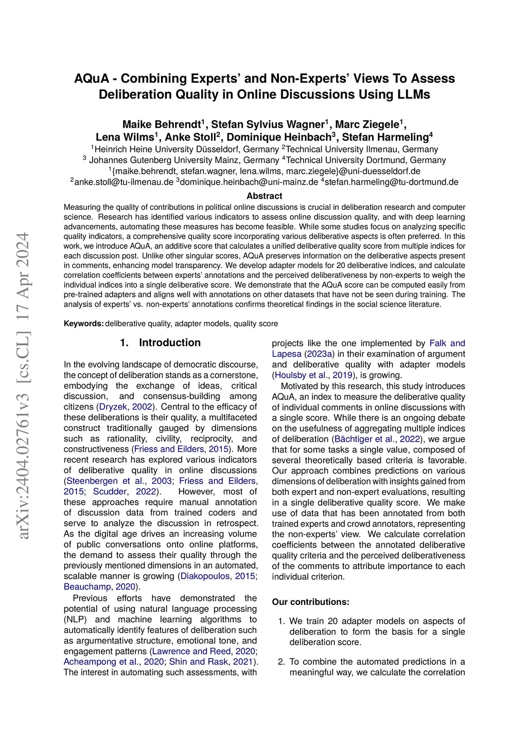 Measuring the quality of contributions in political online discussions is crucial in deliberation research and computer science. Research has identified various indicators to assess online discussion quality, and with deep learning advancements, automating these measures has become feasible. While some studies focus on analyzing specific quality indicators, a comprehensive quality score incorporating various deliberative aspects is often preferred. In this work, we introduce AQuA, an additive score that calculates a unified deliberative quality score from multiple indices for each discussion post. Unlike other singular scores, AQuA preserves information on the deliberative aspects present in comments, enhancing model transparency. We develop adapter models for 20 deliberative indices, and calculate correlation coefficients between experts' annotations and the perceived deliberativeness by non-experts to weigh the individual indices into a single deliberative score. We demonstrate that the AQuA score can be computed easily from pre-trained adapters and aligns well with annotations on other datasets that have not be seen during training. The analysis of experts' vs. non-experts' annotations confirms theoretical findings in the social science literature.