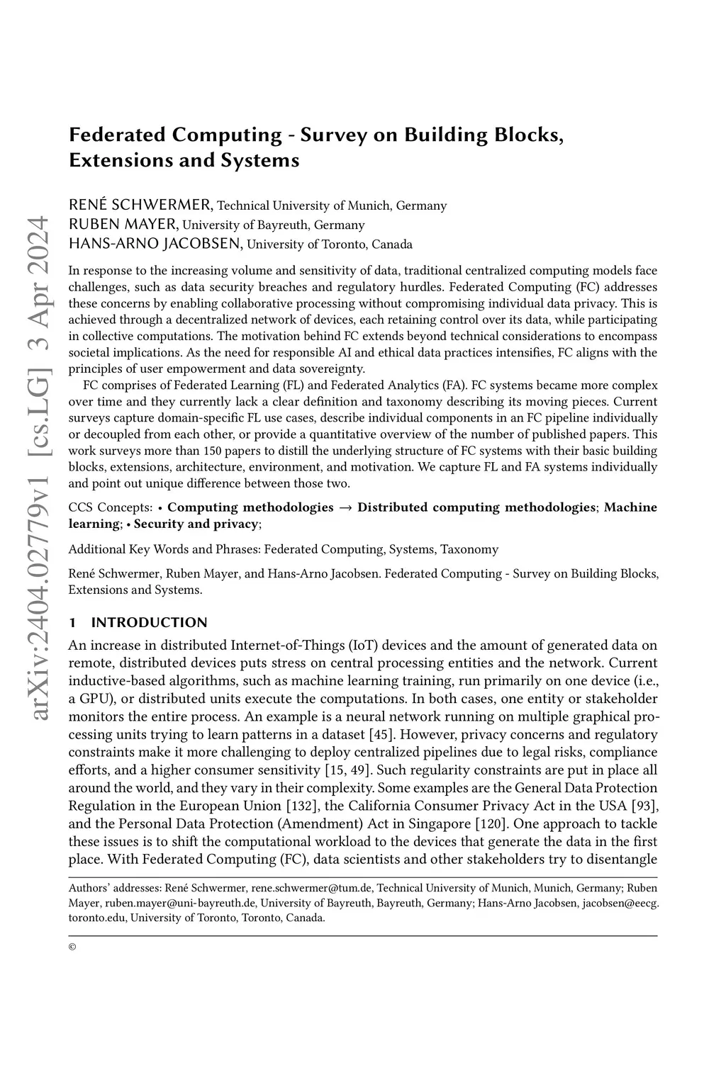 In response to the increasing volume and sensitivity of data, traditional centralized computing models face challenges, such as data security breaches and regulatory hurdles. Federated Computing (FC) addresses these concerns by enabling collaborative processing without compromising individual data privacy. This is achieved through a decentralized network of devices, each retaining control over its data, while participating in collective computations. The motivation behind FC extends beyond technical considerations to encompass societal implications. As the need for responsible AI and ethical data practices intensifies, FC aligns with the principles of user empowerment and data sovereignty. FC comprises of Federated Learning (FL) and Federated Analytics (FA). FC systems became more complex over time and they currently lack a clear definition and taxonomy describing its moving pieces. Current surveys capture domain-specific FL use cases, describe individual components in an FC pipeline individually or decoupled from each other, or provide a quantitative overview of the number of published papers. This work surveys more than 150 papers to distill the underlying structure of FC systems with their basic building blocks, extensions, architecture, environment, and motivation. We capture FL and FA systems individually and point out unique difference between those two.