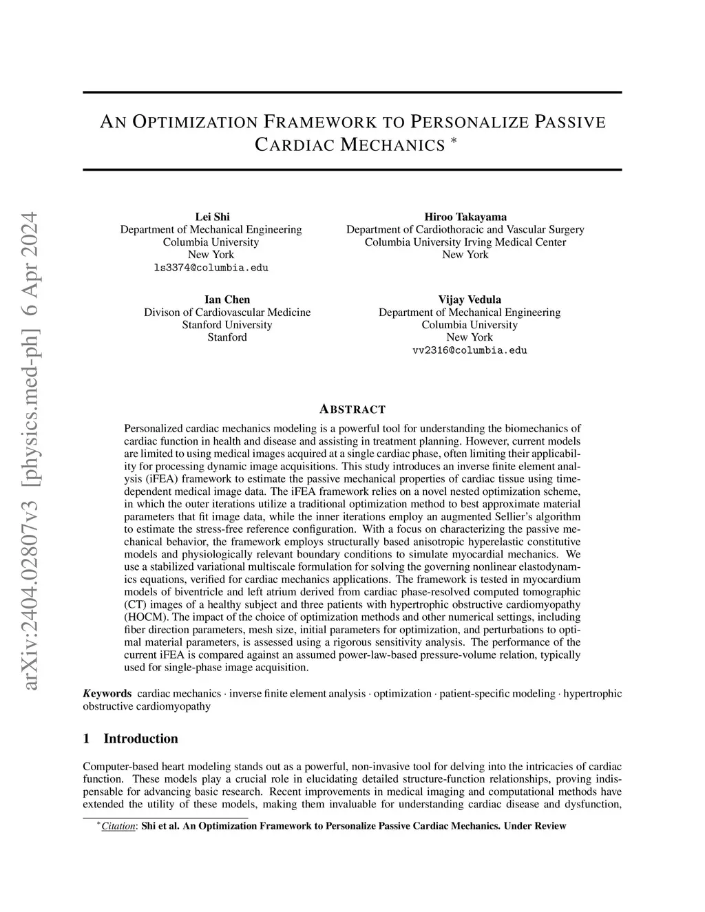 Personalized cardiac mechanics modeling is a powerful tool for understanding the biomechanics of cardiac function in health and disease and assisting in treatment planning. However, current models are limited to using medical images acquired at a single cardiac phase, often limiting their applicability for processing dynamic image acquisitions. This study introduces an inverse finite element analysis (iFEA) framework to estimate the passive mechanical properties of cardiac tissue using time-dependent medical image data. The iFEA framework relies on a novel nested optimization scheme, in which the outer iterations utilize a traditional optimization method to best approximate material parameters that fit image data, while the inner iterations employ an augmented Sellier's algorithm to estimate the stress-free reference configuration. With a focus on characterizing the passive mechanical behavior, the framework employs structurally based anisotropic hyperelastic constitutive models and physiologically relevant boundary conditions to simulate myocardial mechanics. We use a stabilized variational multiscale formulation for solving the governing nonlinear elastodynamics equations, verified for cardiac mechanics applications. The framework is tested in myocardium models of biventricle and left atrium derived from cardiac phase-resolved computed tomographic (CT) images of a healthy subject and three patients with hypertrophic obstructive cardiomyopathy (HOCM). The impact of the choice of optimization methods and other numerical settings, including fiber direction parameters, mesh size, initial parameters for optimization, and perturbations to optimal material parameters, is assessed using a rigorous sensitivity analysis. The performance of the current iFEA is compared against an assumed power-law-based pressure-volume relation, typically used for single-phase image acquisition.