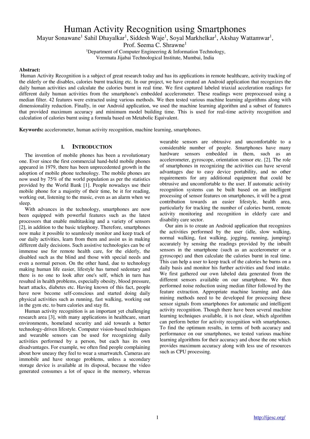 Human Activity Recognition is a subject of great research today and has its applications in remote healthcare, activity tracking of the elderly or the disables, calories burnt tracking etc. In our project, we have created an Android application that recognizes the daily human activities and calculate the calories burnt in real time. We first captured labeled triaxial acceleration readings for different daily human activities from the smartphone's embedded accelerometer. These readings were preprocessed using a median filter. 42 features were extracted using various methods. We then tested various machine learning algorithms along with dimensionality reduction. Finally, in our Android application, we used the machine learning algorithm and a subset of features that provided maximum accuracy and minimum model building time. This is used for real-time activity recognition and calculation of calories burnt using a formula based on Metabolic Equivalent.