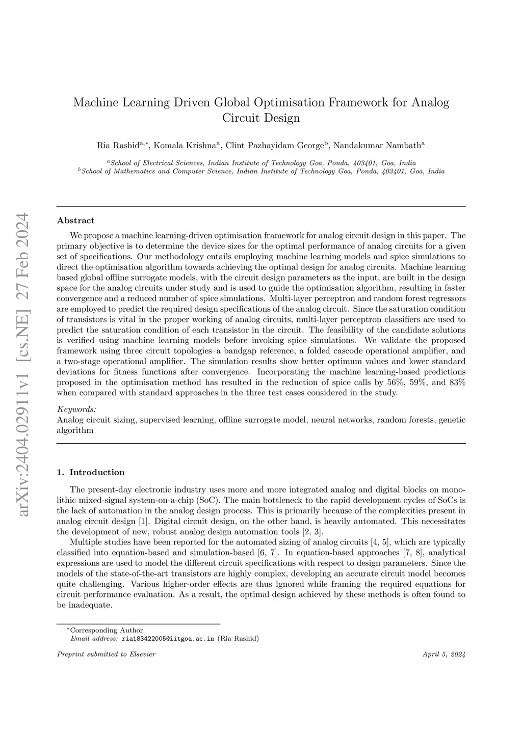 We propose a machine learning-driven optimisation framework for analog circuit design in this paper. The primary objective is to determine the device sizes for the optimal performance of analog circuits for a given set of specifications. Our methodology entails employing machine learning models and spice simulations to direct the optimisation algorithm towards achieving the optimal design for analog circuits. Machine learning based global offline surrogate models, with the circuit design parameters as the input, are built in the design space for the analog circuits under study and is used to guide the optimisation algorithm, resulting in faster convergence and a reduced number of spice simulations. Multi-layer perceptron and random forest regressors are employed to predict the required design specifications of the analog circuit. Since the saturation condition of transistors is vital in the proper working of analog circuits, multi-layer perceptron classifiers are used to predict the saturation condition of each transistor in the circuit. The feasibility of the candidate solutions is verified using machine learning models before invoking spice simulations. We validate the proposed framework using three circuit topologies--a bandgap reference, a folded cascode operational amplifier, and a two-stage operational amplifier. The simulation results show better optimum values and lower standard deviations for fitness functions after convergence. Incorporating the machine learning-based predictions proposed in the optimisation method has resulted in the reduction of spice calls by 56%, 59%, and 83% when compared with standard approaches in the three test cases considered in the study.
