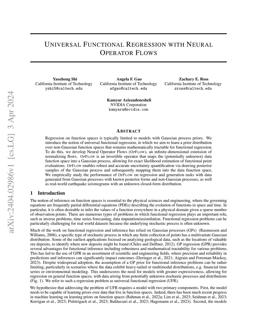 Regression on function spaces is typically limited to models with Gaussian process priors. We introduce the notion of universal functional regression, in which we aim to learn a prior distribution over non-Gaussian function spaces that remains mathematically tractable for functional regression. To do this, we develop Neural Operator Flows (OpFlow), an infinite-dimensional extension of normalizing flows. OpFlow is an invertible operator that maps the (potentially unknown) data function space into a Gaussian process, allowing for exact likelihood estimation of functional point evaluations. OpFlow enables robust and accurate uncertainty quantification via drawing posterior samples of the Gaussian process and subsequently mapping them into the data function space. We empirically study the performance of OpFlow on regression and generation tasks with data generated from Gaussian processes with known posterior forms and non-Gaussian processes, as well as real-world earthquake seismograms with an unknown closed-form distribution.