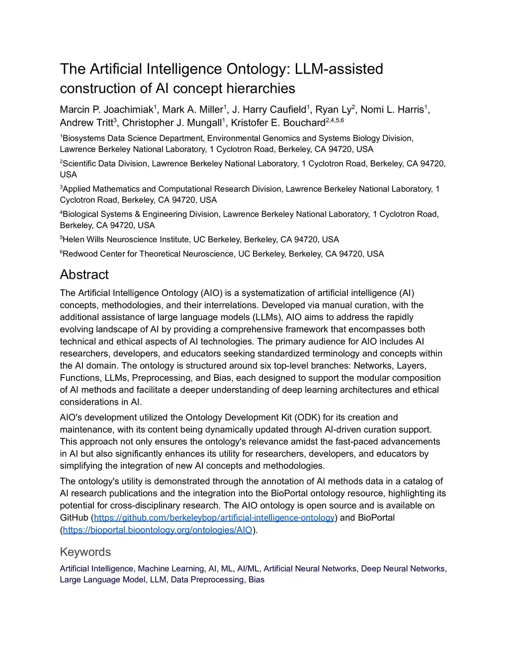 The Artificial Intelligence Ontology (AIO) is a systematization of artificial intelligence (AI) concepts, methodologies, and their interrelations. Developed via manual curation, with the additional assistance of large language models (LLMs), AIO aims to address the rapidly evolving landscape of AI by providing a comprehensive framework that encompasses both technical and ethical aspects of AI technologies. The primary audience for AIO includes AI researchers, developers, and educators seeking standardized terminology and concepts within the AI domain. The ontology is structured around six top-level branches: Networks, Layers, Functions, LLMs, Preprocessing, and Bias, each designed to support the modular composition of AI methods and facilitate a deeper understanding of deep learning architectures and ethical considerations in AI. AIO's development utilized the Ontology Development Kit (ODK) for its creation and maintenance, with its content being dynamically updated through AI-driven curation support. This approach not only ensures the ontology's relevance amidst the fast-paced advancements in AI but also significantly enhances its utility for researchers, developers, and educators by simplifying the integration of new AI concepts and methodologies. The ontology's utility is demonstrated through the annotation of AI methods data in a catalog of AI research publications and the integration into the BioPortal ontology resource, highlighting its potential for cross-disciplinary research. The AIO ontology is open source and is available on GitHub (https://github.com/berkeleybop/artificial-intelligence-ontology) and BioPortal (https://bioportal.bioontology.org/ontologies/AIO).