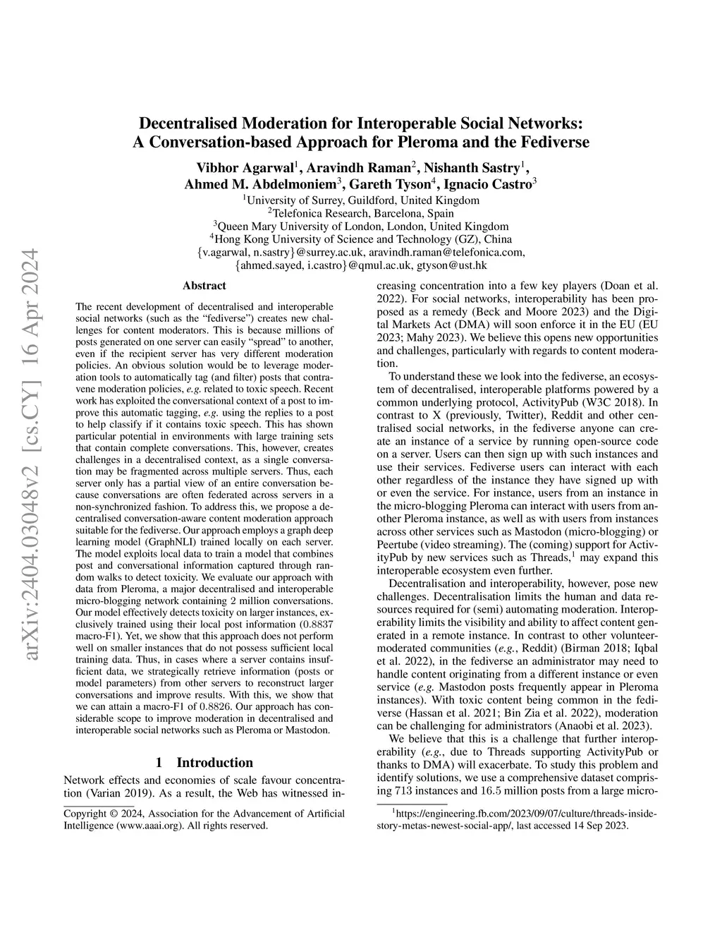 The recent development of decentralised and interoperable social networks (such as the "fediverse") creates new challenges for content moderators. This is because millions of posts generated on one server can easily "spread" to another, even if the recipient server has very different moderation policies. An obvious solution would be to leverage moderation tools to automatically tag (and filter) posts that contravene moderation policies, e.g. related to toxic speech. Recent work has exploited the conversational context of a post to improve this automatic tagging, e.g. using the replies to a post to help classify if it contains toxic speech. This has shown particular potential in environments with large training sets that contain complete conversations. This, however, creates challenges in a decentralised context, as a single conversation may be fragmented across multiple servers. Thus, each server only has a partial view of an entire conversation because conversations are often federated across servers in a non-synchronized fashion. To address this, we propose a decentralised conversation-aware content moderation approach suitable for the fediverse. Our approach employs a graph deep learning model (GraphNLI) trained locally on each server. The model exploits local data to train a model that combines post and conversational information captured through random walks to detect toxicity. We evaluate our approach with data from Pleroma, a major decentralised and interoperable micro-blogging network containing 2 million conversations. Our model effectively detects toxicity on larger instances, exclusively trained using their local post information (0.8837 macro-F1). Our approach has considerable scope to improve moderation in decentralised and interoperable social networks such as Pleroma or Mastodon.