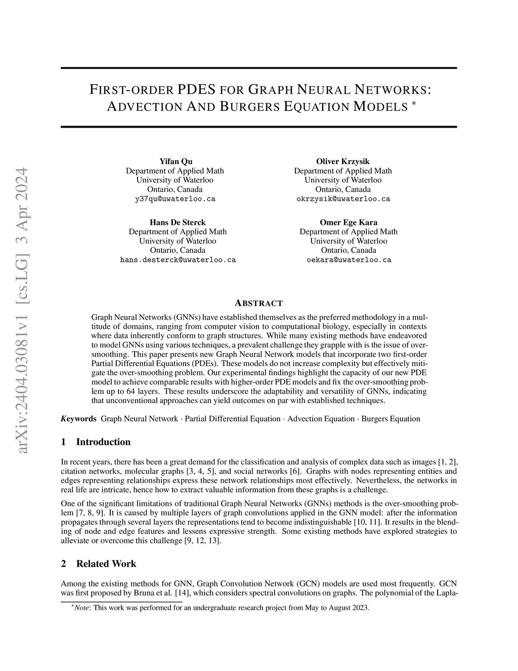 Graph Neural Networks (GNNs) have established themselves as the preferred methodology in a multitude of domains, ranging from computer vision to computational biology, especially in contexts where data inherently conform to graph structures. While many existing methods have endeavored to model GNNs using various techniques, a prevalent challenge they grapple with is the issue of over-smoothing. This paper presents new Graph Neural Network models that incorporate two first-order Partial Differential Equations (PDEs). These models do not increase complexity but effectively mitigate the over-smoothing problem. Our experimental findings highlight the capacity of our new PDE model to achieve comparable results with higher-order PDE models and fix the over-smoothing problem up to 64 layers. These results underscore the adaptability and versatility of GNNs, indicating that unconventional approaches can yield outcomes on par with established techniques.