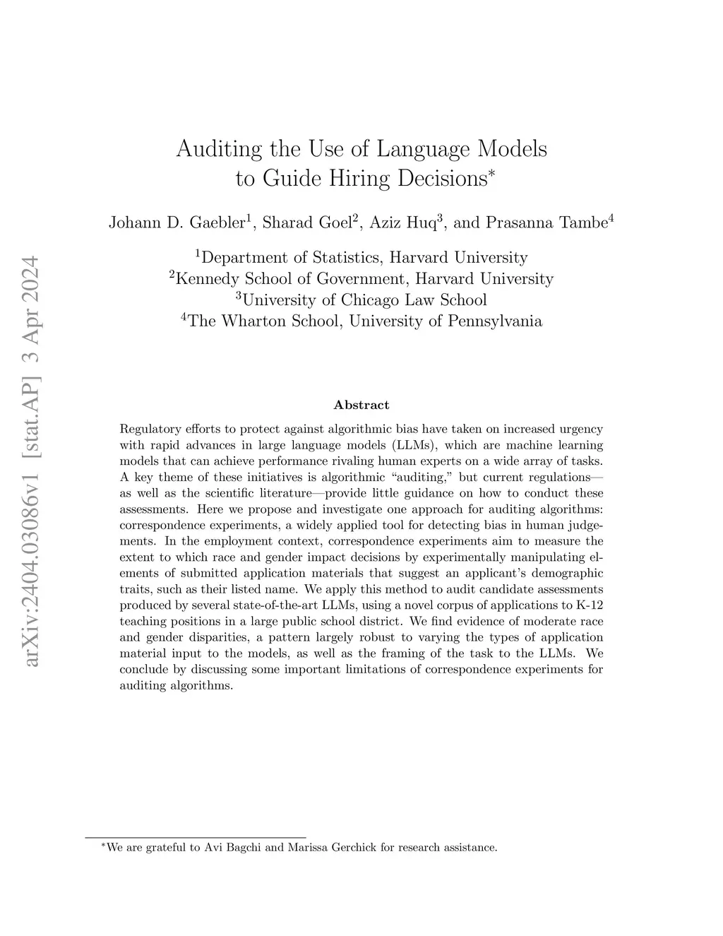 Regulatory efforts to protect against algorithmic bias have taken on increased urgency with rapid advances in large language models (LLMs), which are machine learning models that can achieve performance rivaling human experts on a wide array of tasks. A key theme of these initiatives is algorithmic "auditing," but current regulations -- as well as the scientific literature -- provide little guidance on how to conduct these assessments. Here we propose and investigate one approach for auditing algorithms: correspondence experiments, a widely applied tool for detecting bias in human judgements. In the employment context, correspondence experiments aim to measure the extent to which race and gender impact decisions by experimentally manipulating elements of submitted application materials that suggest an applicant's demographic traits, such as their listed name. We apply this method to audit candidate assessments produced by several state-of-the-art LLMs, using a novel corpus of applications to K-12 teaching positions in a large public school district. We find evidence of moderate race and gender disparities, a pattern largely robust to varying the types of application material input to the models, as well as the framing of the task to the LLMs. We conclude by discussing some important limitations of correspondence experiments for auditing algorithms.