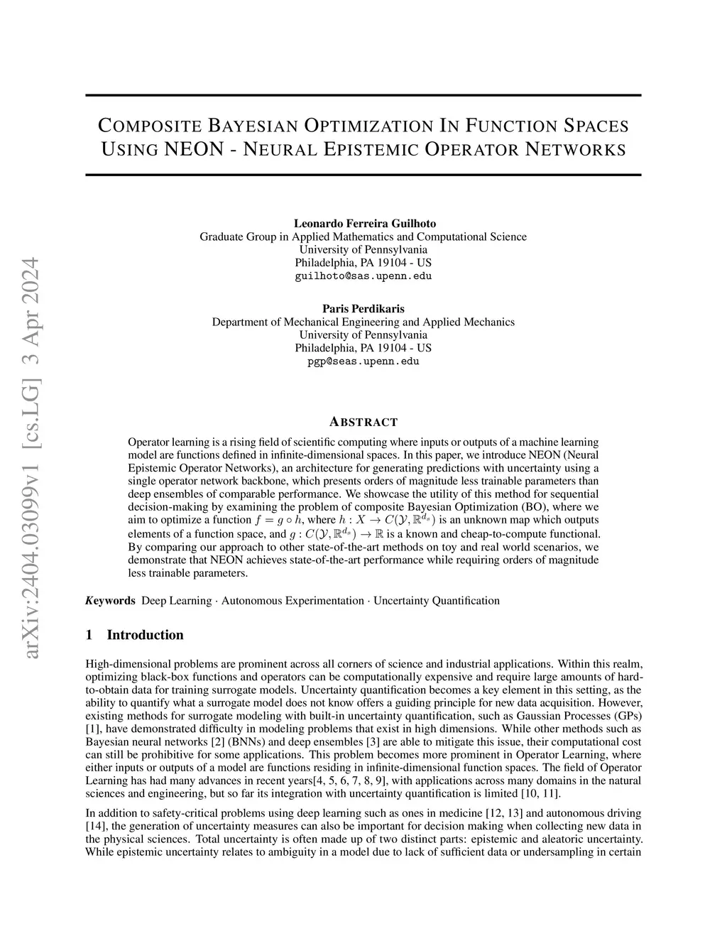 Operator learning is a rising field of scientific computing where inputs or outputs of a machine learning model are functions defined in infinite-dimensional spaces. In this paper, we introduce NEON (Neural Epistemic Operator Networks), an architecture for generating predictions with uncertainty using a single operator network backbone, which presents orders of magnitude less trainable parameters than deep ensembles of comparable performance. We showcase the utility of this method for sequential decision-making by examining the problem of composite Bayesian Optimization (BO), where we aim to optimize a function , where is an unknown map which outputs elements of a function space, and is a known and cheap-to-compute functional. By comparing our approach to other state-of-the-art methods on toy and real world scenarios, we demonstrate that NEON achieves state-of-the-art performance while requiring orders of magnitude less trainable parameters.