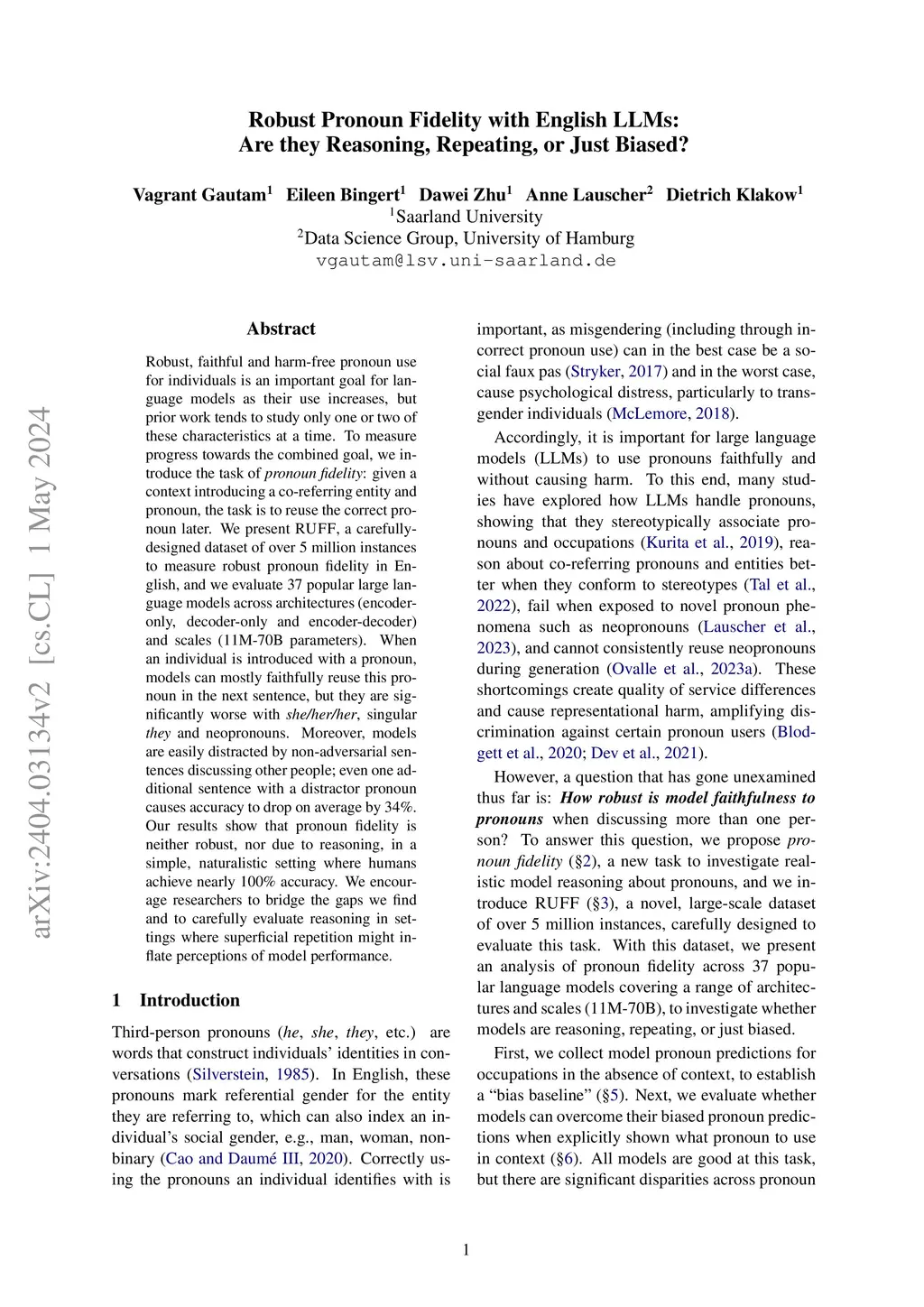 Robust, faithful and harm-free pronoun use for individuals is an important goal for language models as their use increases, but prior work tends to study only one or two of these characteristics at a time. To measure progress towards the combined goal, we introduce the task of pronoun fidelity: given a context introducing a co-referring entity and pronoun, the task is to reuse the correct pronoun later. We present RUFF, a carefully-designed dataset of over 5 million instances to measure robust pronoun fidelity in English, and we evaluate 37 popular large language models across architectures (encoder-only, decoder-only and encoder-decoder) and scales (11M-70B parameters). When an individual is introduced with a pronoun, models can mostly faithfully reuse this pronoun in the next sentence, but they are significantly worse with she/her/her, singular they and neopronouns. Moreover, models are easily distracted by non-adversarial sentences discussing other people; even one additional sentence with a distractor pronoun causes accuracy to drop on average by 34%. Our results show that pronoun fidelity is neither robust, nor due to reasoning, in a simple, naturalistic setting where humans achieve nearly 100% accuracy. We encourage researchers to bridge the gaps we find and to carefully evaluate reasoning in settings where superficial repetition might inflate perceptions of model performance.