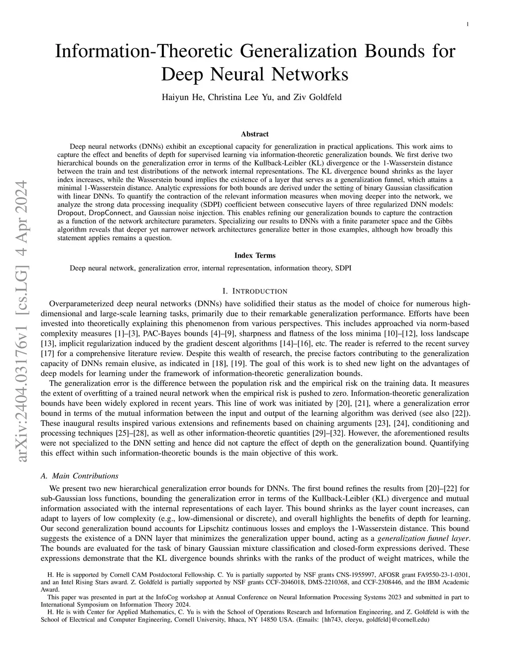 Deep neural networks (DNNs) exhibit an exceptional capacity for generalization in practical applications. This work aims to capture the effect and benefits of depth for supervised learning via information-theoretic generalization bounds. We first derive two hierarchical bounds on the generalization error in terms of the Kullback-Leibler (KL) divergence or the 1-Wasserstein distance between the train and test distributions of the network internal representations. The KL divergence bound shrinks as the layer index increases, while the Wasserstein bound implies the existence of a layer that serves as a generalization funnel, which attains a minimal 1-Wasserstein distance. Analytic expressions for both bounds are derived under the setting of binary Gaussian classification with linear DNNs. To quantify the contraction of the relevant information measures when moving deeper into the network, we analyze the strong data processing inequality (SDPI) coefficient between consecutive layers of three regularized DNN models: , , and Gaussian noise injection. This enables refining our generalization bounds to capture the contraction as a function of the network architecture parameters. Specializing our results to DNNs with a finite parameter space and the Gibbs algorithm reveals that deeper yet narrower network architectures generalize better in those examples, although how broadly this statement applies remains a question.