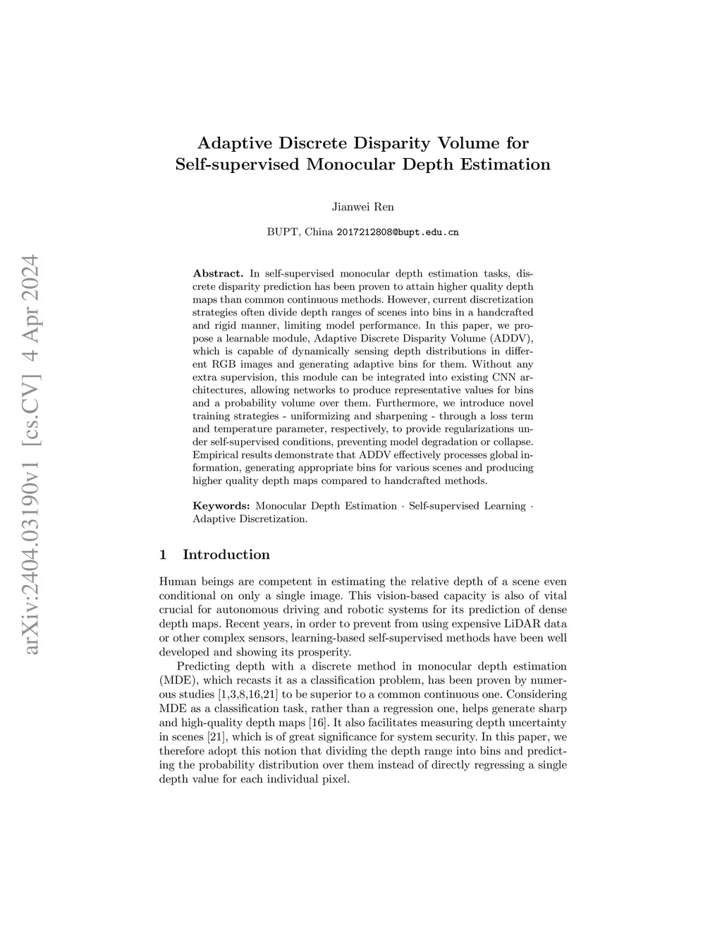 Adaptive Discrete Disparity Volume for Self-supervised Monocular Depth