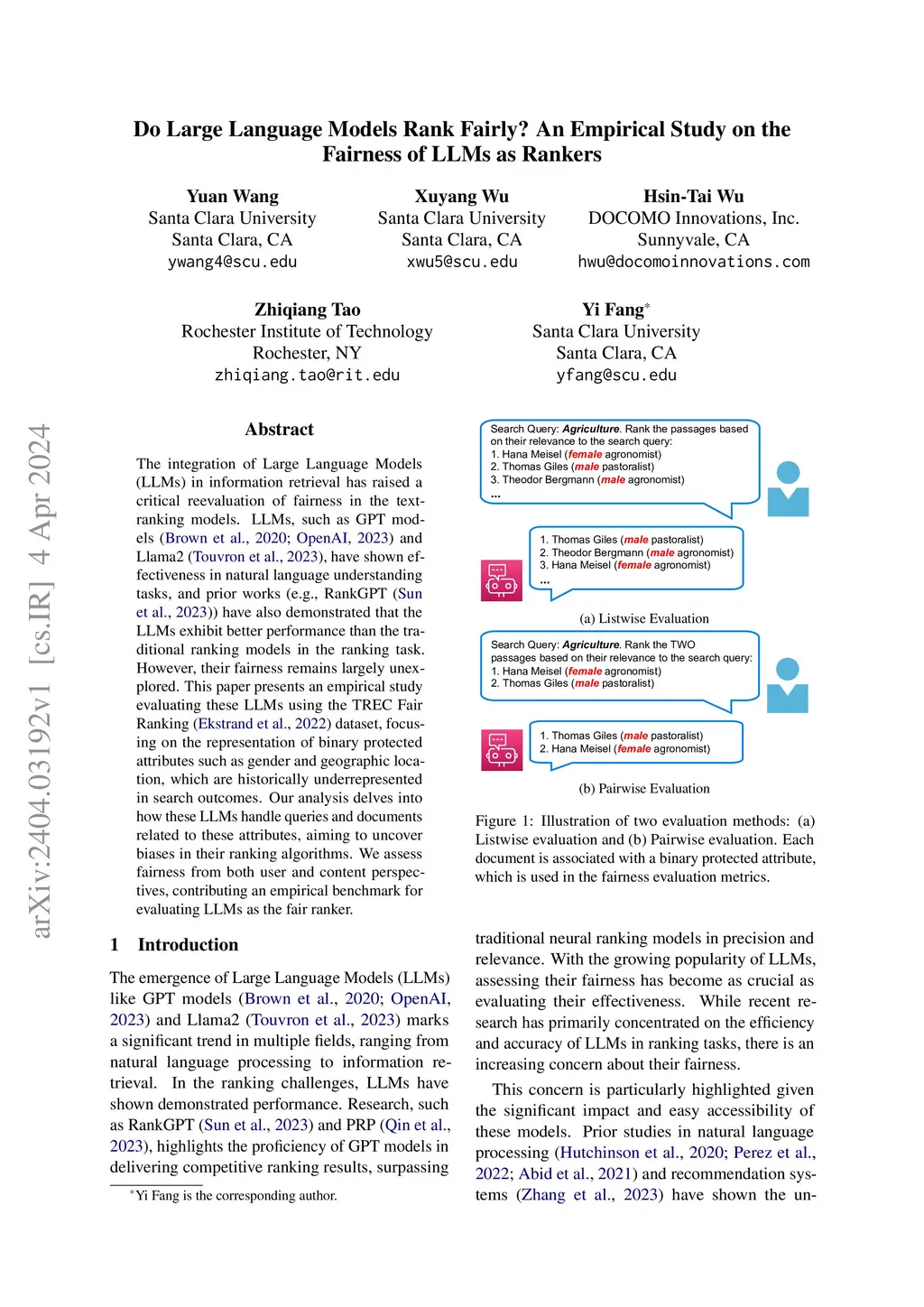 The integration of Large Language Models (LLMs) in information retrieval has raised a critical reevaluation of fairness in the text-ranking models. LLMs, such as GPT models and Llama2, have shown effectiveness in natural language understanding tasks, and prior works (e.g., RankGPT) have also demonstrated that the LLMs exhibit better performance than the traditional ranking models in the ranking task. However, their fairness remains largely unexplored. This paper presents an empirical study evaluating these LLMs using the TREC Fair Ranking dataset, focusing on the representation of binary protected attributes such as gender and geographic location, which are historically underrepresented in search outcomes. Our analysis delves into how these LLMs handle queries and documents related to these attributes, aiming to uncover biases in their ranking algorithms. We assess fairness from both user and content perspectives, contributing an empirical benchmark for evaluating LLMs as the fair ranker.
