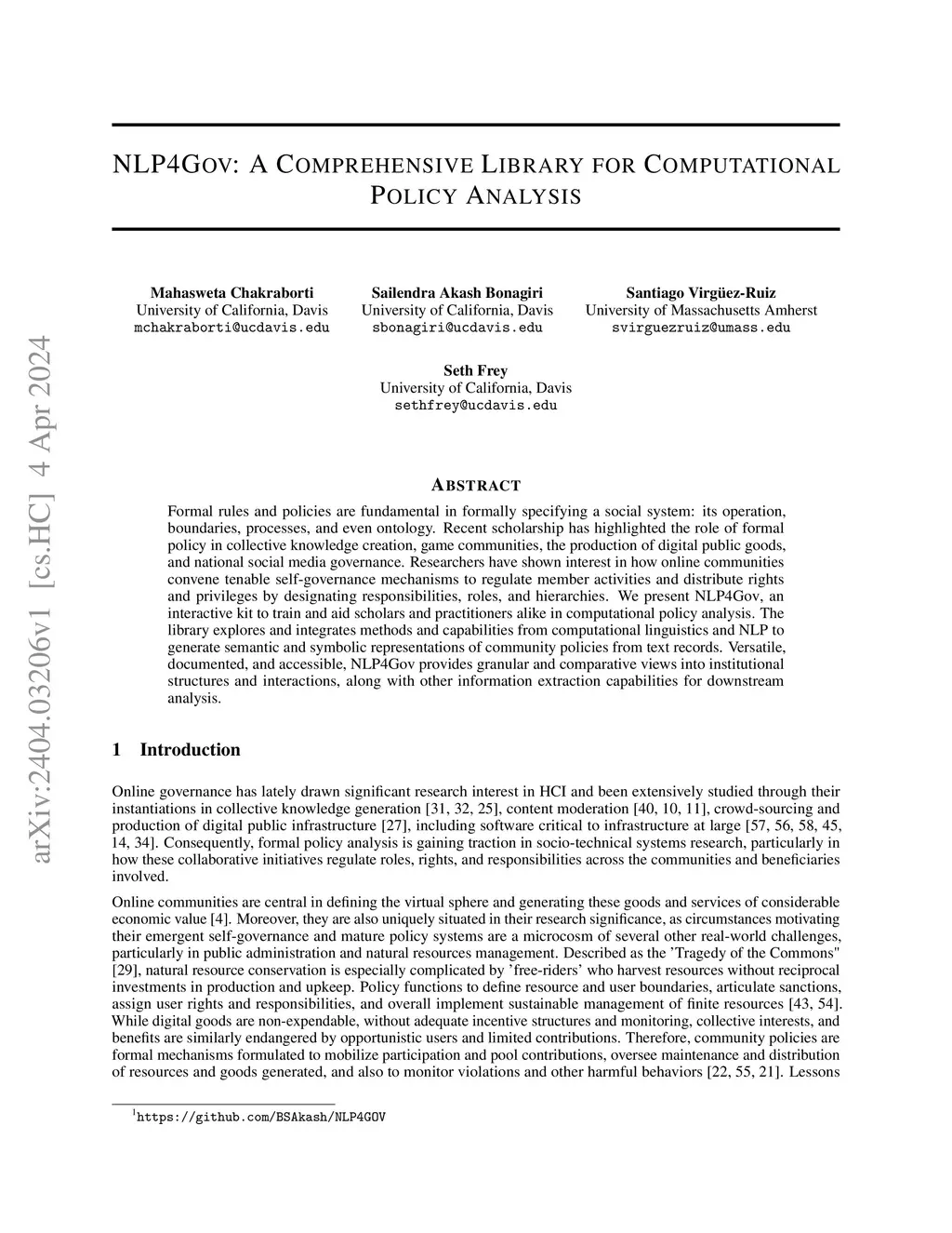 Formal rules and policies are fundamental in formally specifying a social system: its operation, boundaries, processes, and even ontology. Recent scholarship has highlighted the role of formal policy in collective knowledge creation, game communities, the production of digital public goods, and national social media governance. Researchers have shown interest in how online communities convene tenable self-governance mechanisms to regulate member activities and distribute rights and privileges by designating responsibilities, roles, and hierarchies. We present NLP4Gov, an interactive kit to train and aid scholars and practitioners alike in computational policy analysis. The library explores and integrates methods and capabilities from computational linguistics and NLP to generate semantic and symbolic representations of community policies from text records. Versatile, documented, and accessible, NLP4Gov provides granular and comparative views into institutional structures and interactions, along with other information extraction capabilities for downstream analysis.