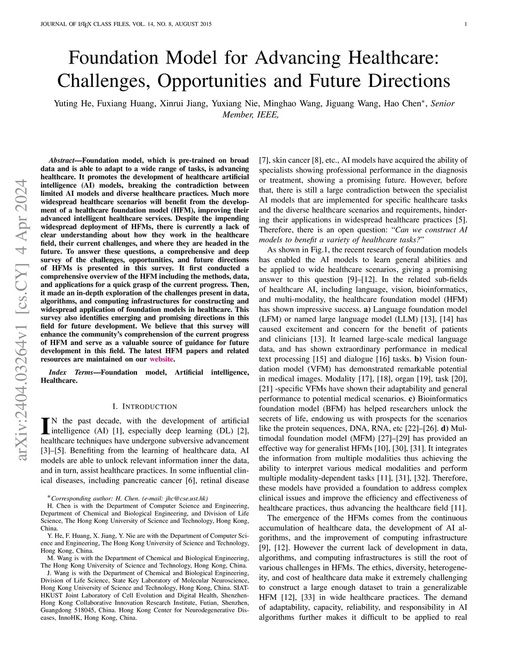 Foundation model, which is pre-trained on broad data and is able to adapt to a wide range of tasks, is advancing healthcare. It promotes the development of healthcare artificial intelligence (AI) models, breaking the contradiction between limited AI models and diverse healthcare practices. Much more widespread healthcare scenarios will benefit from the development of a healthcare foundation model (HFM), improving their advanced intelligent healthcare services. Despite the impending widespread deployment of HFMs, there is currently a lack of clear understanding about how they work in the healthcare field, their current challenges, and where they are headed in the future. To answer these questions, a comprehensive and deep survey of the challenges, opportunities, and future directions of HFMs is presented in this survey. It first conducted a comprehensive overview of the HFM including the methods, data, and applications for a quick grasp of the current progress. Then, it made an in-depth exploration of the challenges present in data, algorithms, and computing infrastructures for constructing and widespread application of foundation models in healthcare. This survey also identifies emerging and promising directions in this field for future development. We believe that this survey will enhance the community's comprehension of the current progress of HFM and serve as a valuable source of guidance for future development in this field. The latest HFM papers and related resources are maintained on our website: https://github.com/YutingHe-list/Awesome-Foundation-Models-for-Advancing-Healthcare.