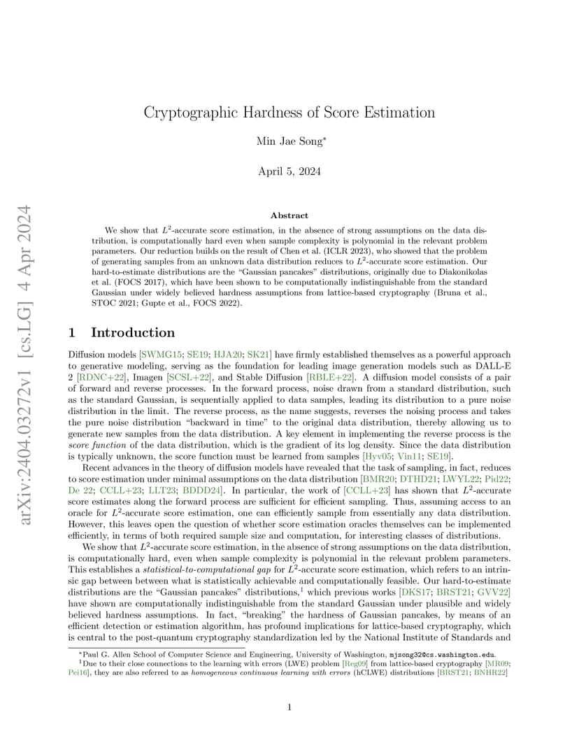 We show that -accurate score estimation, in the absence of strong assumptions on the data distribution, is computationally hard even when sample complexity is polynomial in the relevant problem parameters. Our reduction builds on the result of Chen et al. (ICLR 2023), who showed that the problem of generating samples from an unknown data distribution reduces to -accurate score estimation. Our hard-to-estimate distributions are the "Gaussian pancakes" distributions, originally due to Diakonikolas et al. (FOCS 2017), which have been shown to be computationally indistinguishable from the standard Gaussian under widely believed hardness assumptions from lattice-based cryptography (Bruna et al., STOC 2021; Gupte et al., FOCS 2022).