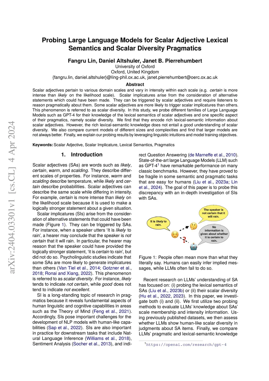 Scalar adjectives pertain to various domain scales and vary in intensity within each scale (e.g. certain is more intense than likely on the likelihood scale). Scalar implicatures arise from the consideration of alternative statements which could have been made. They can be triggered by scalar adjectives and require listeners to reason pragmatically about them. Some scalar adjectives are more likely to trigger scalar implicatures than others. This phenomenon is referred to as scalar diversity. In this study, we probe different families of Large Language Models such as GPT-4 for their knowledge of the lexical semantics of scalar adjectives and one specific aspect of their pragmatics, namely scalar diversity. We find that they encode rich lexical-semantic information about scalar adjectives. However, the rich lexical-semantic knowledge does not entail a good understanding of scalar diversity. We also compare current models of different sizes and complexities and find that larger models are not always better. Finally, we explain our probing results by leveraging linguistic intuitions and model training objectives.
