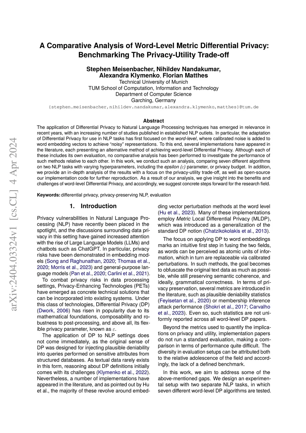 The application of Differential Privacy to Natural Language Processing techniques has emerged in relevance in recent years, with an increasing number of studies published in established NLP outlets. In particular, the adaptation of Differential Privacy for use in NLP tasks has first focused on the , where calibrated noise is added to word embedding vectors to achieve "noisy" representations. To this end, several implementations have appeared in the literature, each presenting an alternative method of achieving word-level Differential Privacy. Although each of these includes its own evaluation, no comparative analysis has been performed to investigate the performance of such methods relative to each other. In this work, we conduct such an analysis, comparing seven different algorithms on two NLP tasks with varying hyperparameters, including the \textit{epsilon (\varepsilon)} parameter, or privacy budget. In addition, we provide an in-depth analysis of the results with a focus on the privacy-utility trade-off, as well as open-source our implementation code for further reproduction. As a result of our analysis, we give insight into the benefits and challenges of word-level Differential Privacy, and accordingly, we suggest concrete steps forward for the research field.