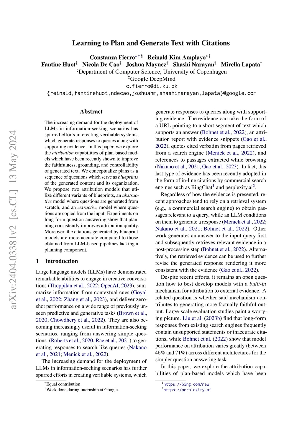 The increasing demand for the deployment of LLMs in information-seeking scenarios has spurred efforts in creating verifiable systems, which generate responses to queries along with supporting evidence. In this paper, we explore the attribution capabilities of plan-based models which have been recently shown to improve the faithfulness, grounding, and controllability of generated text. We conceptualize plans as a sequence of questions which serve as blueprints of the generated content and its organization. We propose two attribution models that utilize different variants of blueprints, an abstractive model where questions are generated from scratch, and an extractive model where questions are copied from the input. Experiments on long-form question-answering show that planning consistently improves attribution quality. Moreover, the citations generated by blueprint models are more accurate compared to those obtained from LLM-based pipelines lacking a planning component.