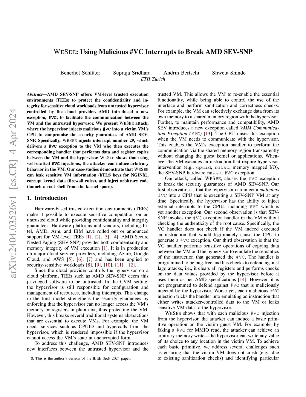 AMD SEV-SNP offers VM-level trusted execution environments (TEEs) to protect the confidentiality and integrity for sensitive cloud workloads from untrusted hypervisor controlled by the cloud provider. AMD introduced a new exception, #VC, to facilitate the communication between the VM and the untrusted hypervisor. We present WeSee attack, where the hypervisor injects malicious #VC into a victim VM's CPU to compromise the security guarantees of AMD SEV-SNP. Specifically, WeSee injects interrupt number 29, which delivers a #VC exception to the VM who then executes the corresponding handler that performs data and register copies between the VM and the hypervisor. WeSee shows that using well-crafted #VC injections, the attacker can induce arbitrary behavior in the VM. Our case-studies demonstrate that WeSee can leak sensitive VM information (kTLS keys for NGINX), corrupt kernel data (firewall rules), and inject arbitrary code (launch a root shell from the kernel space).