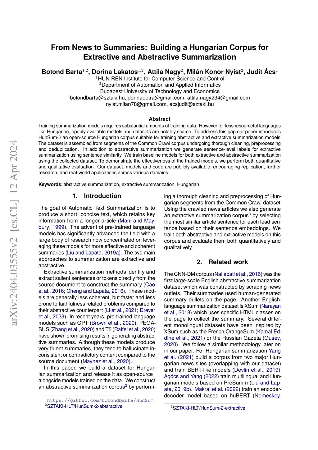 Training summarization models requires substantial amounts of training data. However for less resourceful languages like Hungarian, openly available models and datasets are notably scarce. To address this gap our paper introduces HunSum-2 an open-source Hungarian corpus suitable for training abstractive and extractive summarization models. The dataset is assembled from segments of the Common Crawl corpus undergoing thorough cleaning, preprocessing and deduplication. In addition to abstractive summarization we generate sentence-level labels for extractive summarization using sentence similarity. We train baseline models for both extractive and abstractive summarization using the collected dataset. To demonstrate the effectiveness of the trained models, we perform both quantitative and qualitative evaluation. Our dataset, models and code are publicly available, encouraging replication, further research, and real-world applications across various domains.