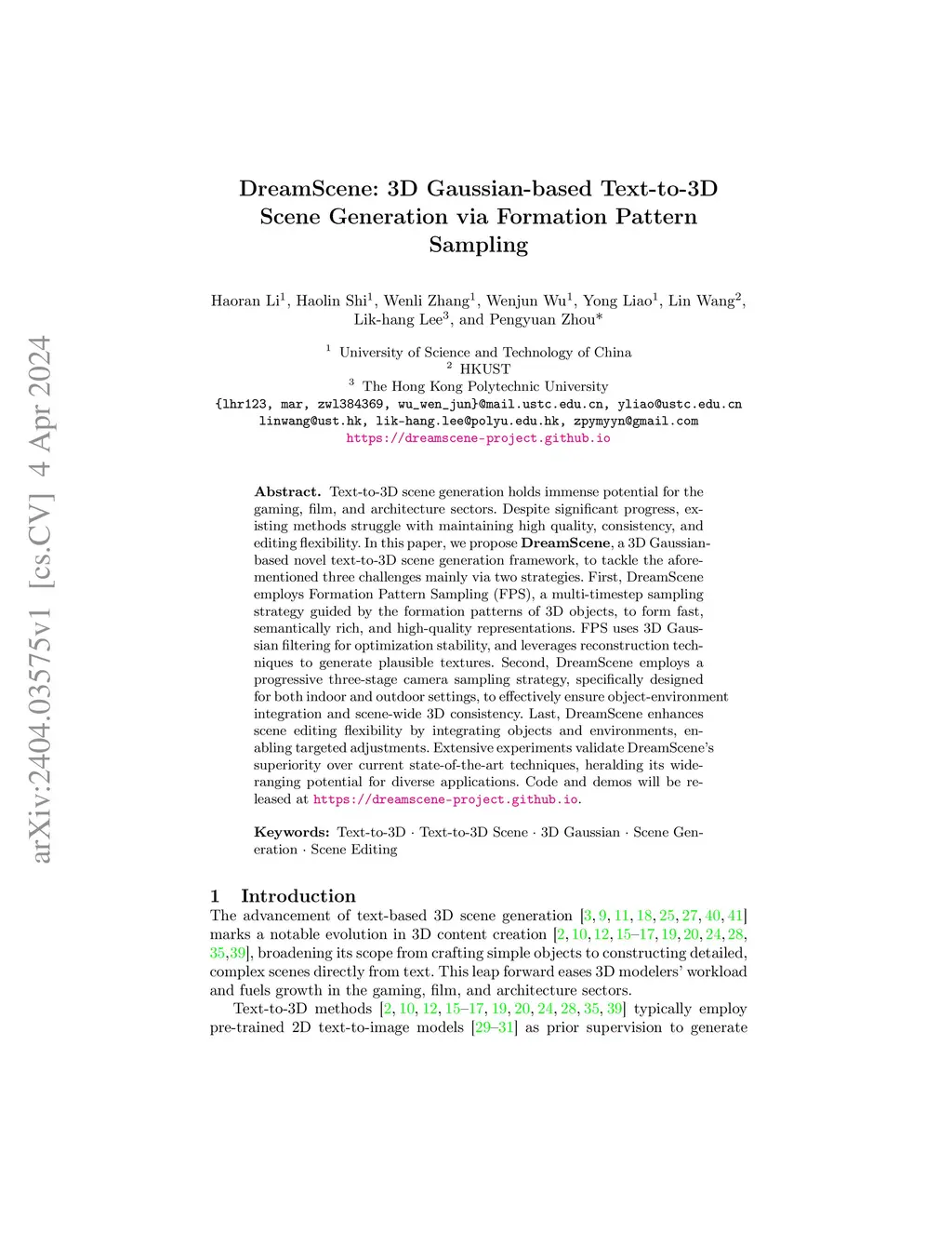 Text-to-3D scene generation holds immense potential for the gaming, film, and architecture sectors. Despite significant progress, existing methods struggle with maintaining high quality, consistency, and editing flexibility. In this paper, we propose DreamScene, a 3D Gaussian-based novel text-to-3D scene generation framework, to tackle the aforementioned three challenges mainly via two strategies. First, DreamScene employs Formation Pattern Sampling (FPS), a multi-timestep sampling strategy guided by the formation patterns of 3D objects, to form fast, semantically rich, and high-quality representations. FPS uses 3D Gaussian filtering for optimization stability, and leverages reconstruction techniques to generate plausible textures. Second, DreamScene employs a progressive three-stage camera sampling strategy, specifically designed for both indoor and outdoor settings, to effectively ensure object-environment integration and scene-wide 3D consistency. Last, DreamScene enhances scene editing flexibility by integrating objects and environments, enabling targeted adjustments. Extensive experiments validate DreamScene's superiority over current state-of-the-art techniques, heralding its wide-ranging potential for diverse applications. Code and demos will be released at https://dreamscene-project.github.io .